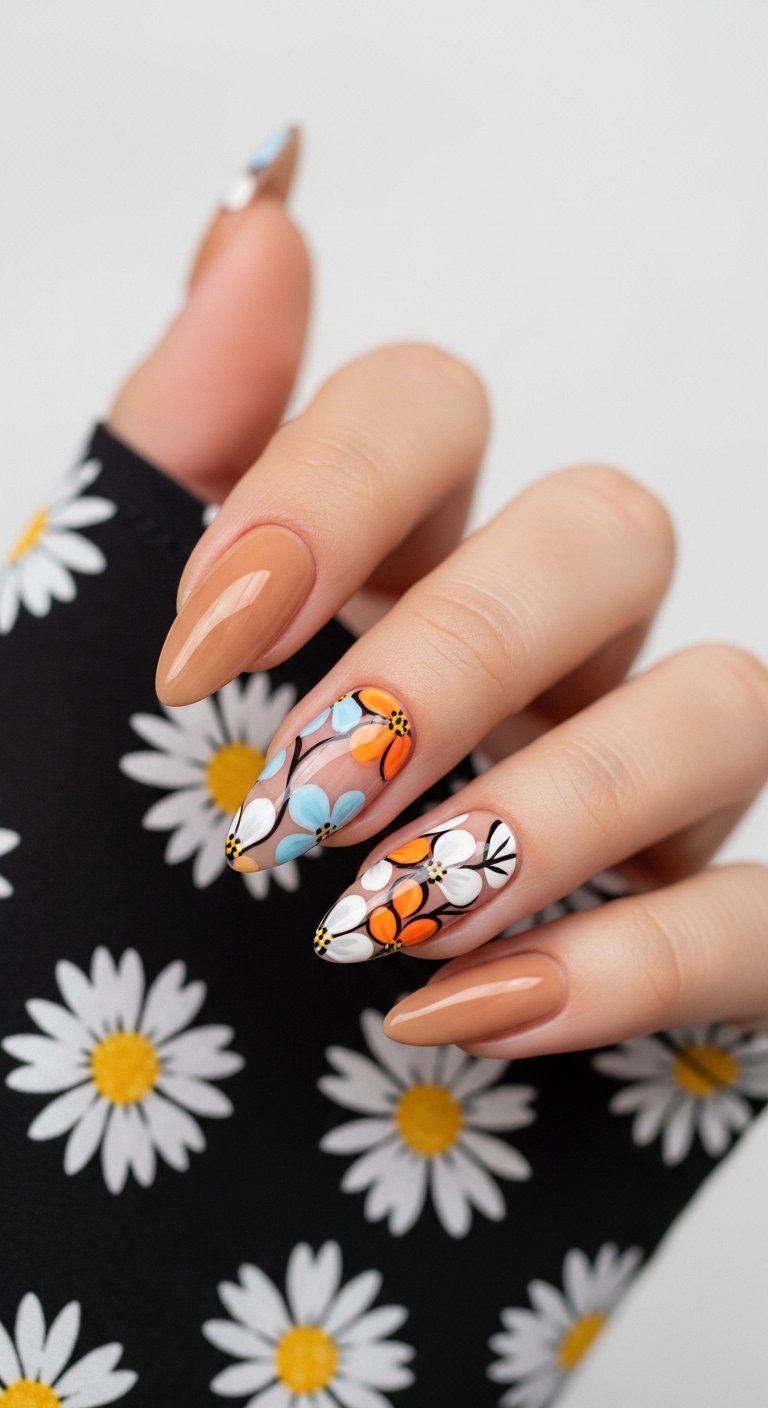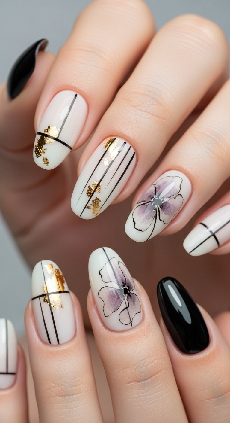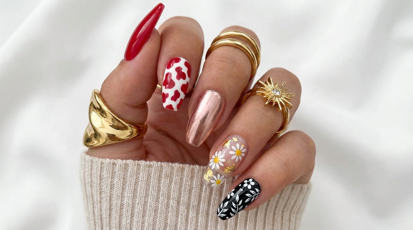 Keep the background color consistent, like a creamy white, to tie the mismatched flowers together. Alternatively, do a Skittles manicure (different base color on each nail) and paint white flowers on all of them. The key is balance. If one nail has a large flower, try a pattern of small flowers on the next to avoid visual overcrowding.
