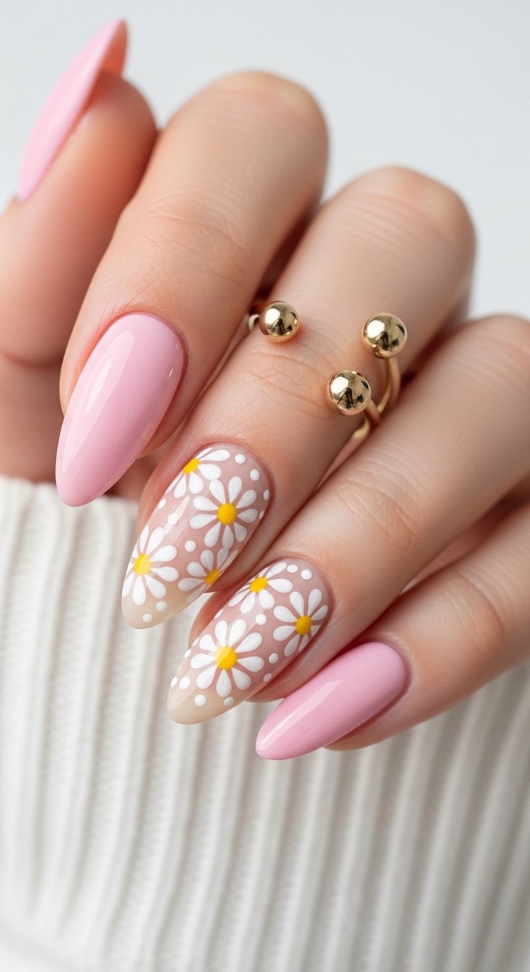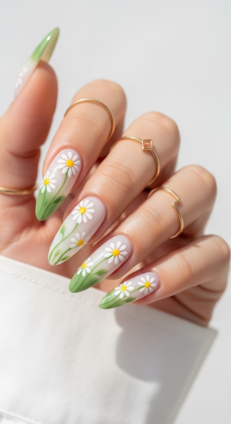 This design updates the classic French manicure. Instead of a stark white line, tiny daisies form the crescent shape at the tip of the nail. The negative space on the rest of the nail keeps the look clean and modern. It balances playfulness with sophistication. The small scale of the flowers ensures the design does not look childish. This style is currently trending heavily on social media due to its retro 90s influence mixed with modern minimalism.