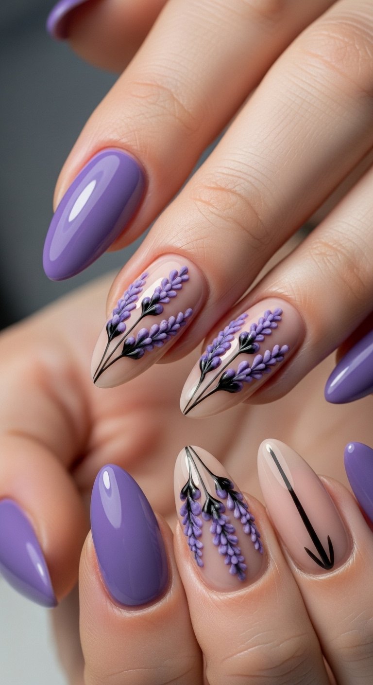 Use a very fine brush to flick green lines upwards. Use a dotting tool or the very tip of your brush to dab shades of purple along the top third of the stem. Vary the purple shades from dark to light to create volume. This design looks beautiful with a matte finish, mimicking the dry texture of real lavender.