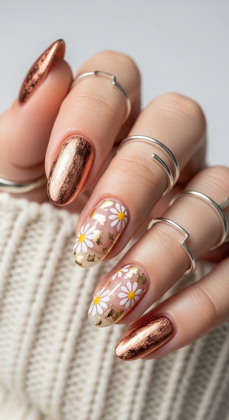 Luxury meets nature in this refined design. The focus here is on the silhouette of the flower rather than the color. Delicate gold chrome or metallic polish traces the outline of leaves and petals against a nude or clear background. The light catches the metallic lines, adding a subtle shimmer that looks like fine jewelry for your hands. This is perfect for formal events where you want nail art that isn’t too loud.