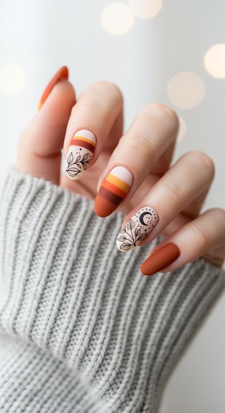 Sakura, or cherry blossoms, represent renewal. This design features jagged black or brown branches stretching across multiple nails, adorned with tiny pink flowers. It creates a panoramic scene across your hand. The vibe is delicate and serene. It is a massive trend every spring. The aesthetic is heavily influenced by Asian art and calligraphy.