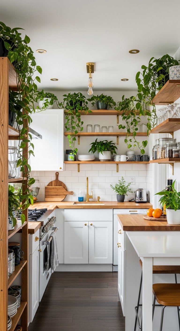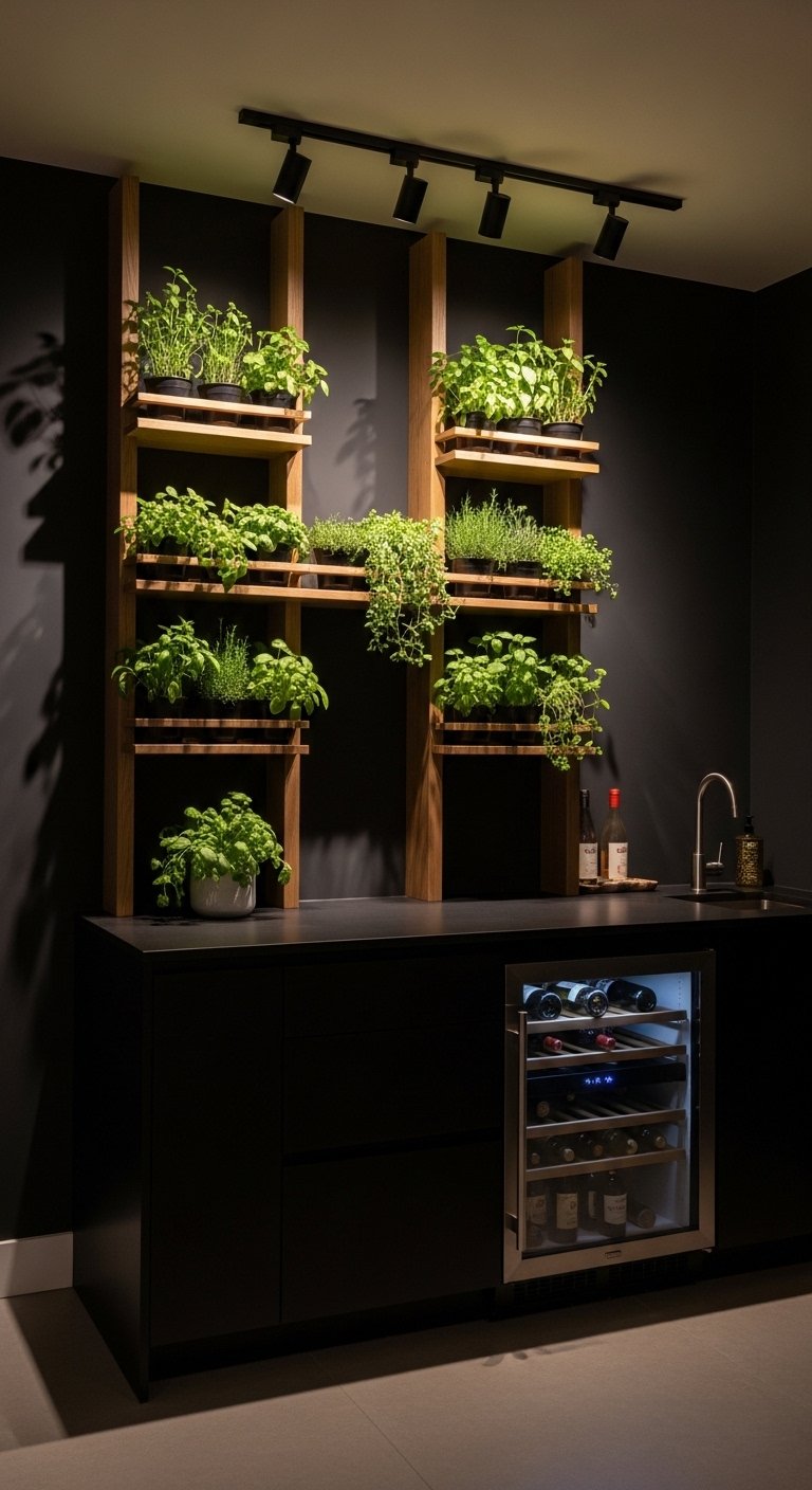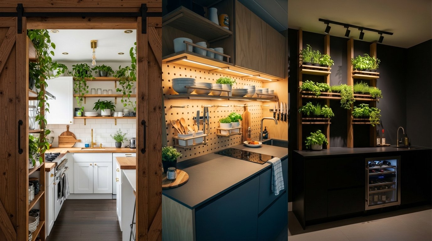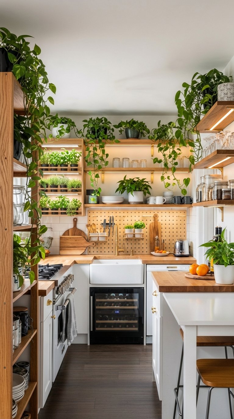 You crave fresh basil and mint but lack the windowsill space. A vertical herb garden solves this problem by using the walls. You mount a series of small planters or a rail system on a sun drenched section of the wall. This approach brings vibrant greenery into the room. The green leaves contrast beautifully against neutral wall colors. The texture of the plants softens the hard lines of cabinets and appliances. You gain immediate access to fresh ingredients while cooking. This setup eliminates the need for cluttering your limited counter surface with pots. The vertical arrangement draws the eye upward and makes the ceiling feel higher. You create a living focal point that smells amazing.