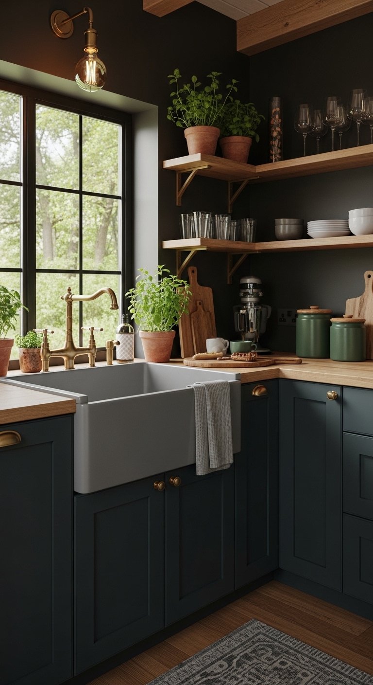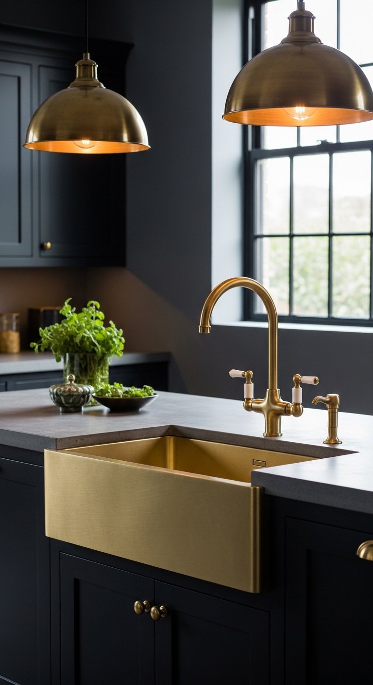 Metallic finishes reflect light just like mirrors do. You incorporate stainless steel backsplashes or copper accents. The shiny surfaces bounce light around the dark corners of the kitchen. You mix metals like brass hardware with chrome appliances for a curated look. The metallic sheen adds a touch of luxury and sophistication. You choose a hammered metal sink as a focal point. The material is durable and easy to clean. The reflection creates an illusion of depth that pushes the walls back. You balance the cool metals with warm textures like wood or rugs.