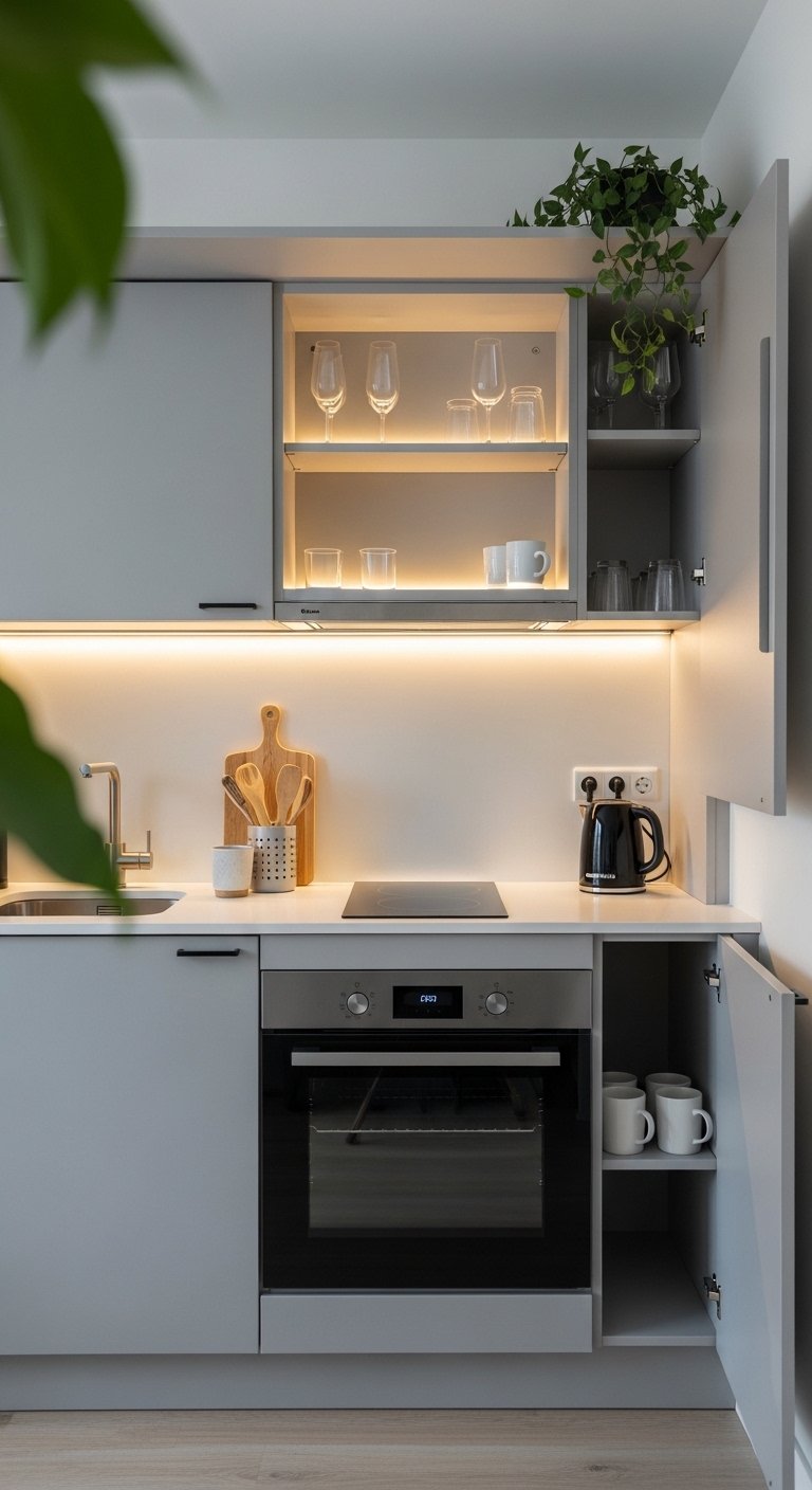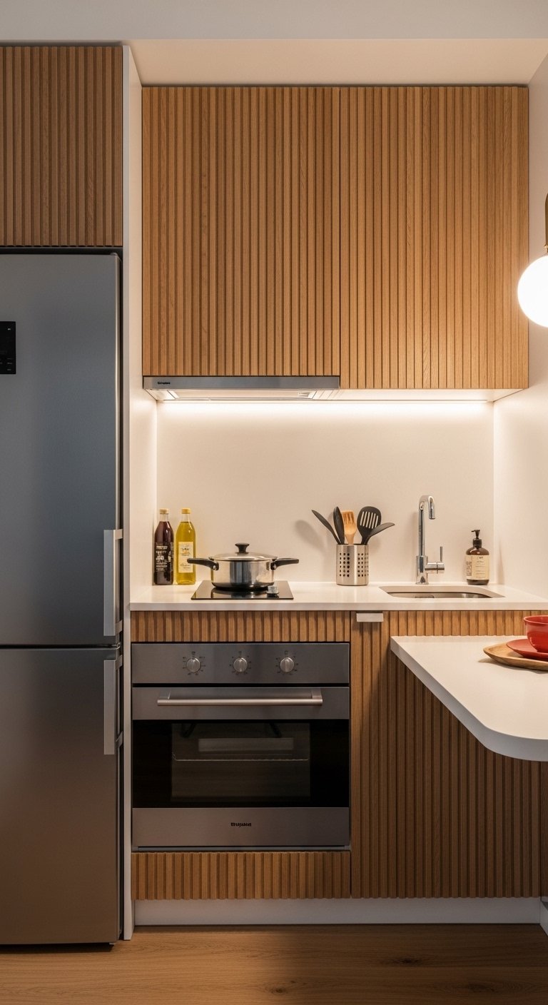 Shadows make small spaces feel cramped and dingy. You layer different types of lighting to open up the room. You install under cabinet LED strips to illuminate the countertops. This task lighting makes food preparation safer and easier. You add recessed can lights in the ceiling for general brightness. The bright white light bounces off surfaces to create a sense of volume. You avoid bulky fixtures that lower the ceiling visually. The clean light mimics natural daylight. You light up the toe kicks of the cabinets for a modern floating effect.