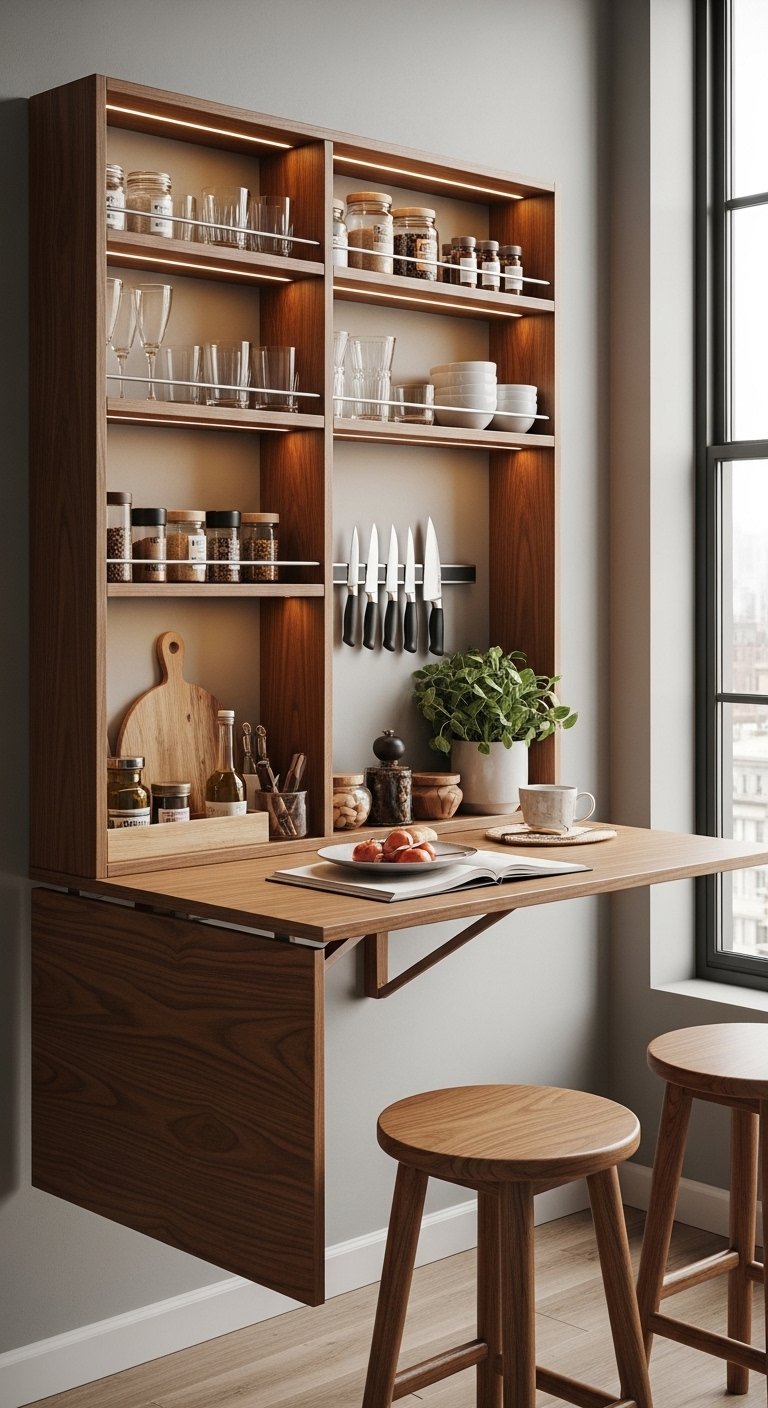 You do not need a formal dining room to enjoy a meal. Fold down tables offer the perfect compromise for small apartments. You mount a drop leaf table to the wall. The table folds flat against the wall when not in use to free up floor space. You lift it up only when you need to eat or work. You pair it with folding chairs that hang on a hook. The mechanism is sturdy and reliable. The wood or laminate surface matches your kitchen decor. This flexibility transforms your kitchen into a multi purpose room. You reclaim the area for movement during the day.