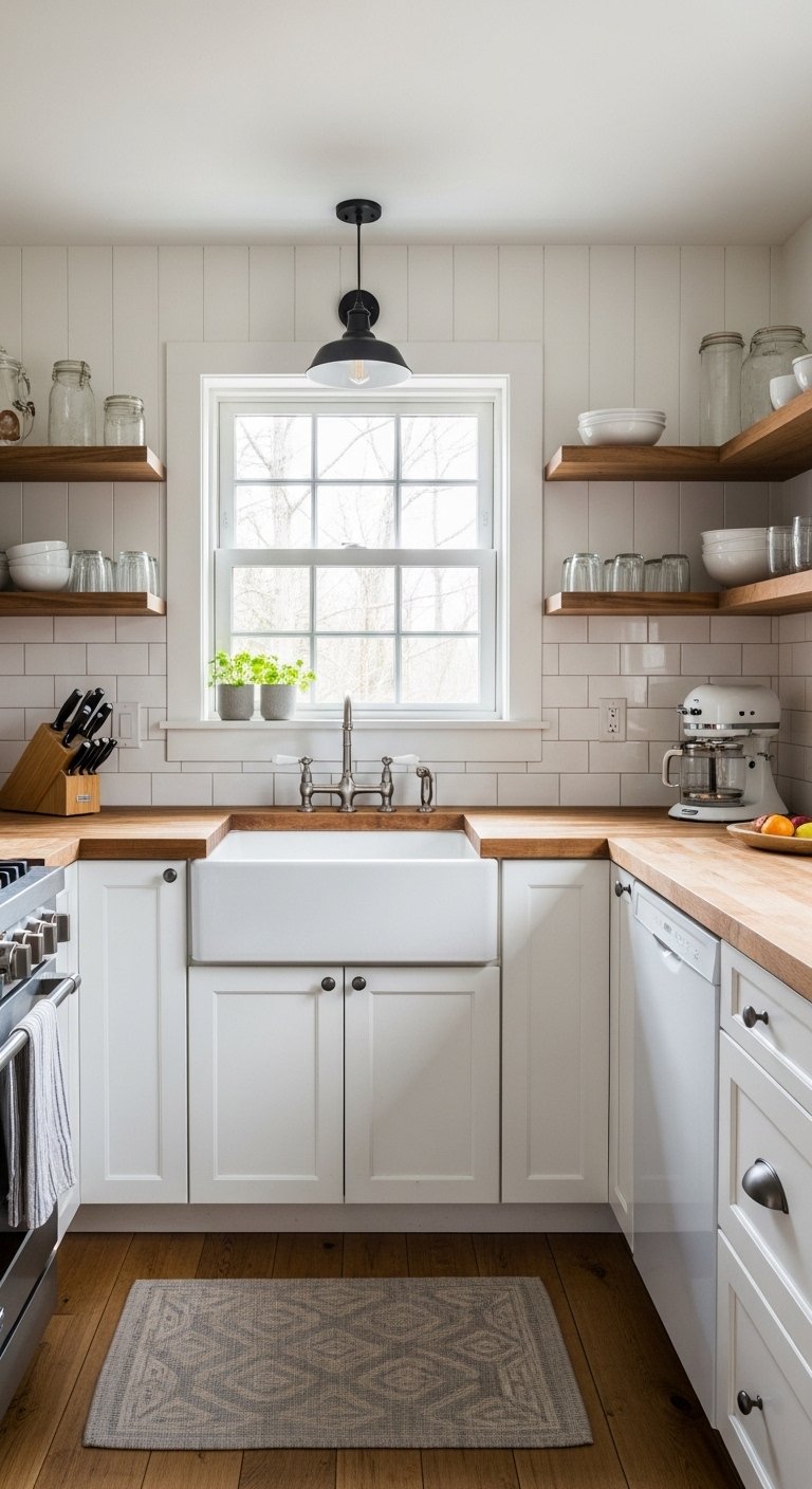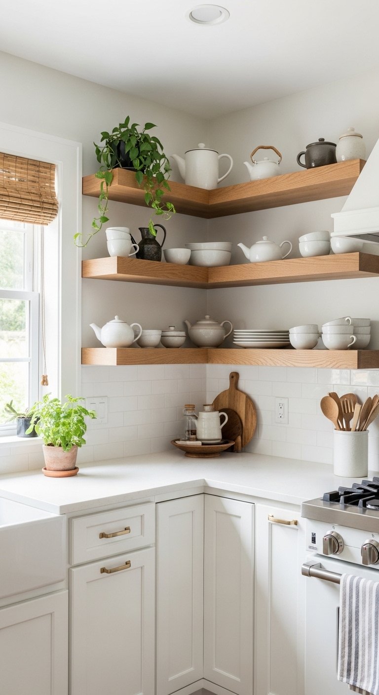 Bulky upper cabinets often make a tiny kitchen feel claustrophobic. Floating shelves offer an airy alternative that opens up the room. You remove cabinet doors or install thick wooden planks directly into the wall studs. This open storage forces you to edit your collection to the essentials. You display your best ceramics and glassware as decor. The negative space around the items allows light to travel freely across the room. The shelves create horizontal lines that visually widen the wall. You can mix functional items like plates with decorative plants. The lack of heavy hardware contributes to a sleek and modern appearance.