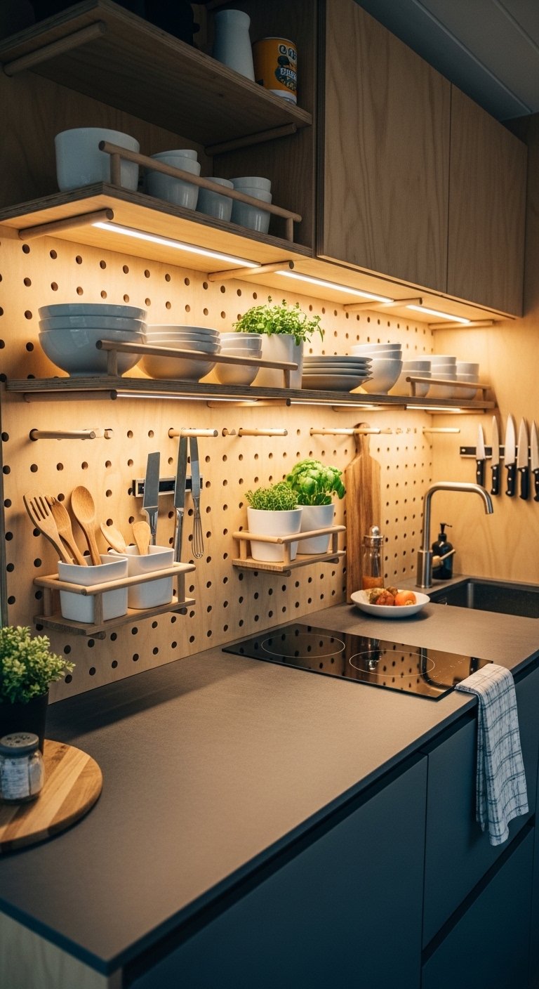 A blank wall becomes a storage powerhouse with a pegboard. You install a large perforated board painted to match your walls. Hooks hold pans and ladles and measuring cups. You see exactly where everything is instantly. The arrangement is fully customizable as your collection changes. You add small shelves for spices or timers. The industrial look fits well with modern or eclectic styles. You free up drawer space for other items. The flat profile of the board takes up zero floor space. You create a functional art piece with your kitchen tools.