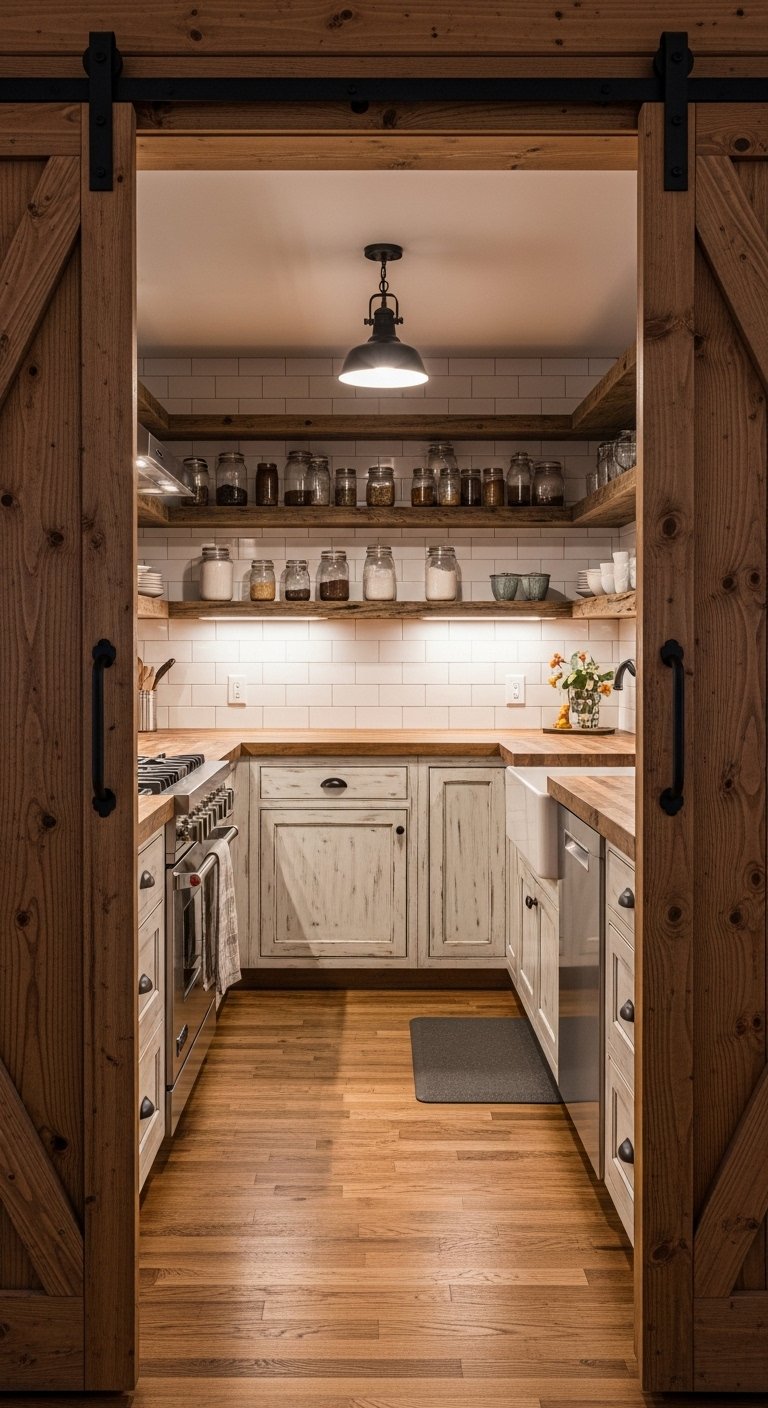 Traditional swing doors eat up valuable floor space when they open. A sliding barn door eliminates this clearance requirement entirely. You mount a track above the doorway on the exterior wall. The door glides smoothly along the wall to open the kitchen. You can choose a rustic wood door for warmth or a frosted glass door for light flow. The hardware adds a decorative industrial element. The mechanism allows you to place furniture or appliances right next to the entrance. You gain at least nine square feet of usable space by removing the door swing.