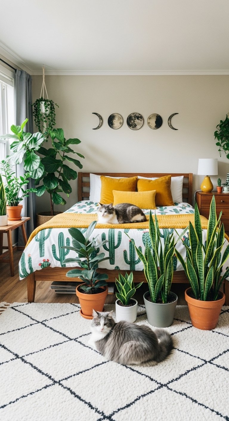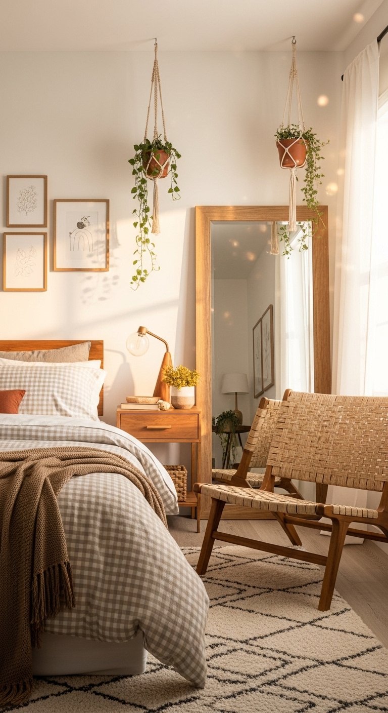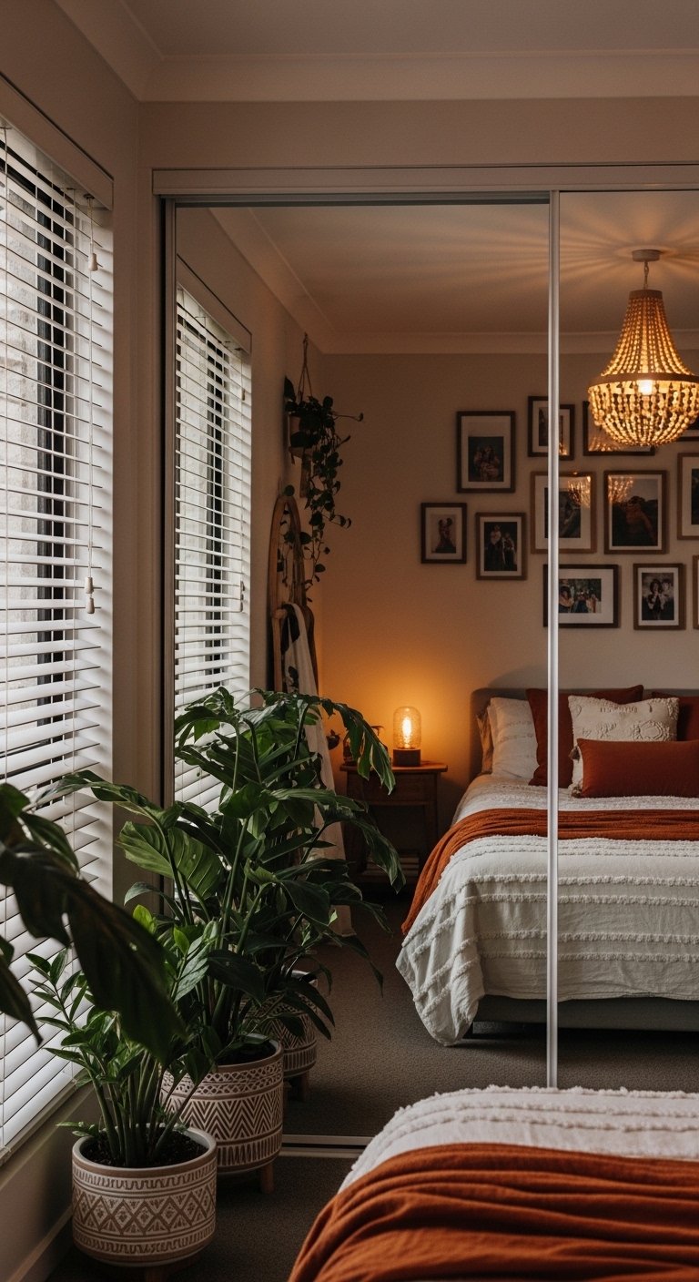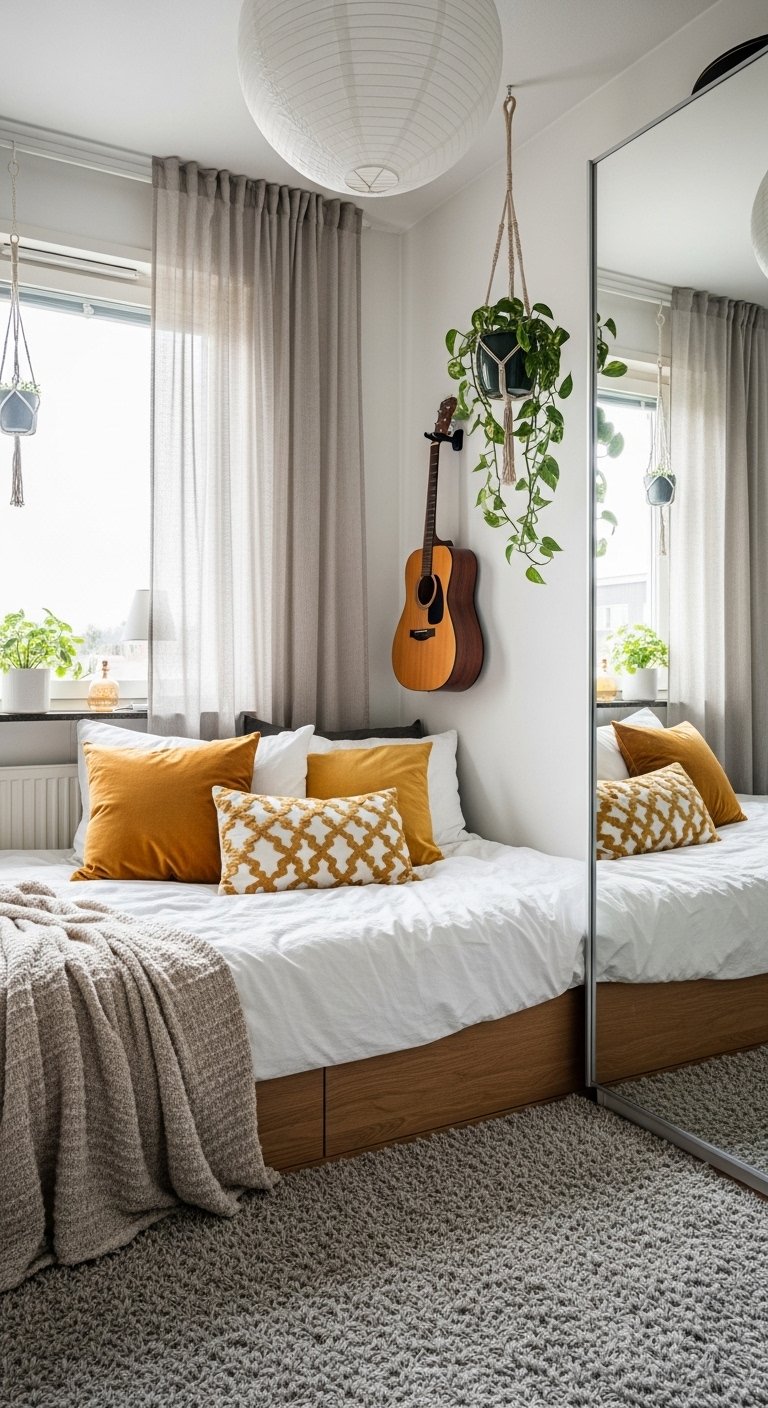 Maximalism can work in small spaces if executed with a bohemian flair. This style embraces the “more is more” philosophy but uses intentional layering. You can mix patterns and plants to create a cozy and nest like environment. The key is to fill the space with items that bring joy and comfort. A floor cushion can serve as extra seating without the bulk of a chair. The visual density creates a feeling of intimacy and warmth. You should use a consistent warm color tone to tie the eclectic mix together. This prevents the room from feeling messy. The “crowding” here is actually a form of cocooning that makes a small bedroom feel safe and personal.