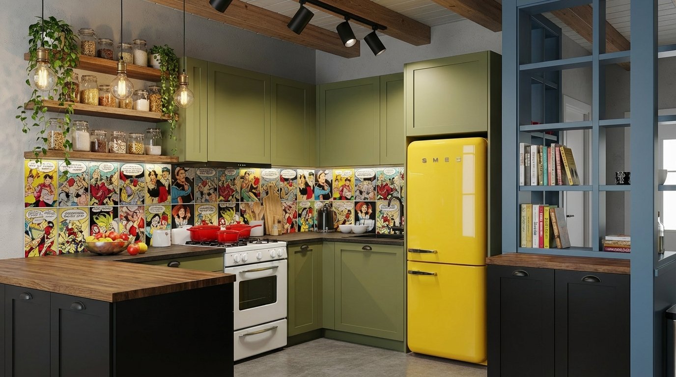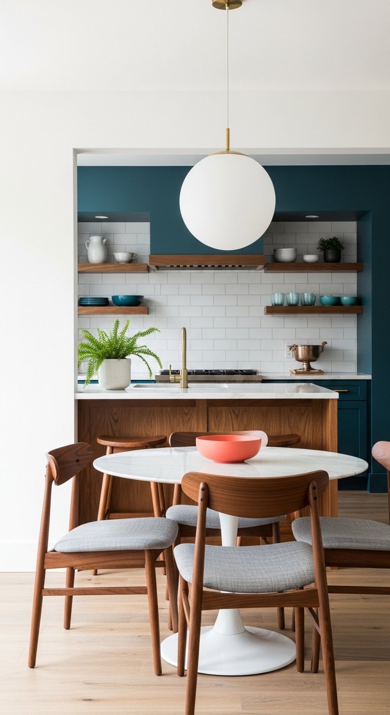 Hang art on this accent wall. A gallery wall of vintage food prints or botanical illustrations adds personality. Install floating shelves to display your favorite cookbooks. This wall becomes the personality of the kitchen. It draws attention away from the utilitarian zones. It makes the kitchen feel like a decorated room, not just a workspace.