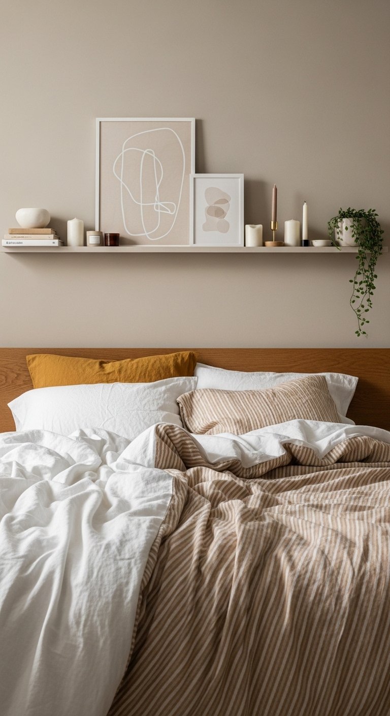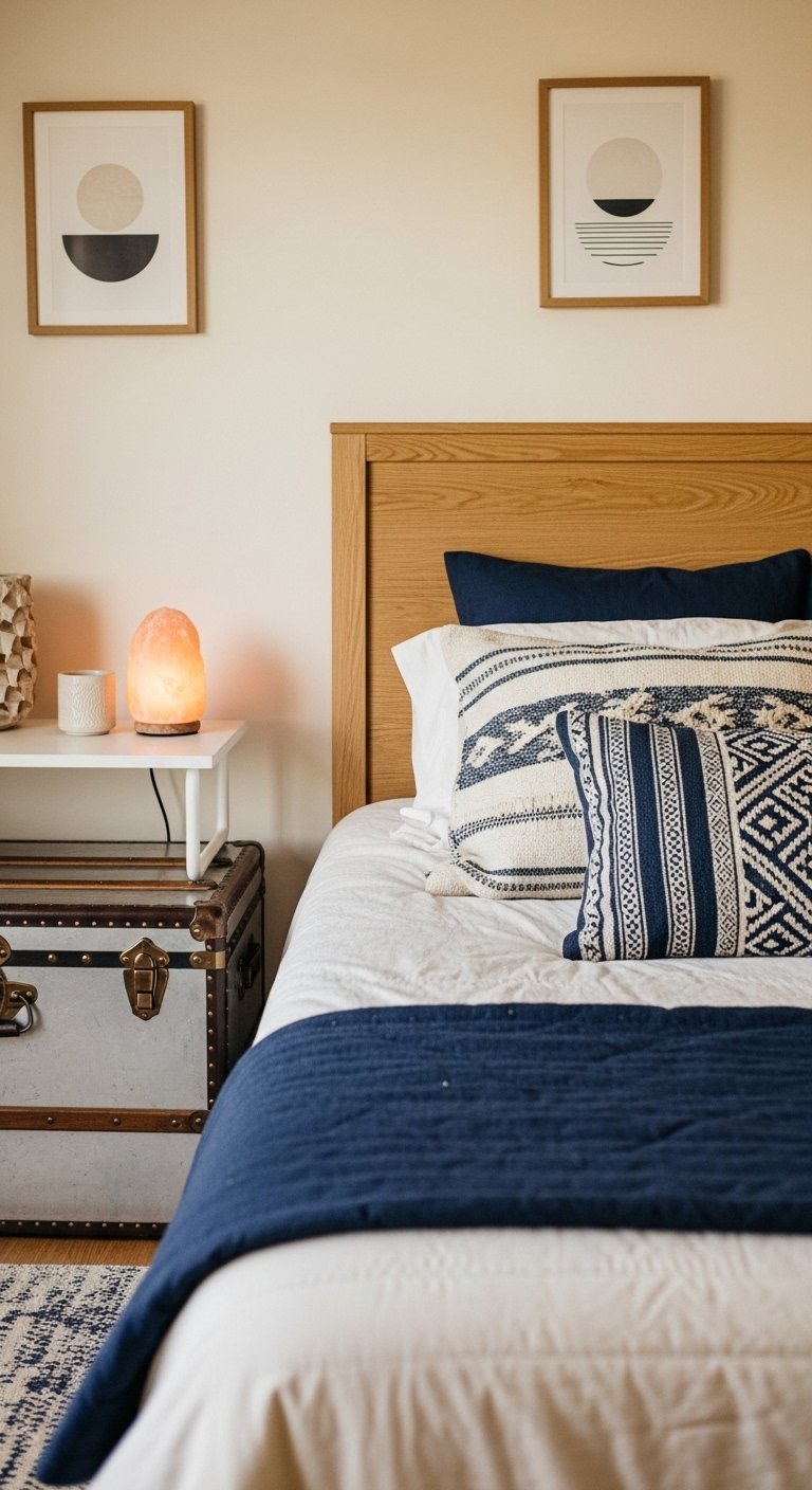 Swap a metal nightstand for a wooden stump or a rattan side table. Use a linen duvet cover instead of synthetic polyester. These materials age beautifully and add character. The variation in natural grain and weave provides visual interest without the need for loud patterns that can shrink a room.