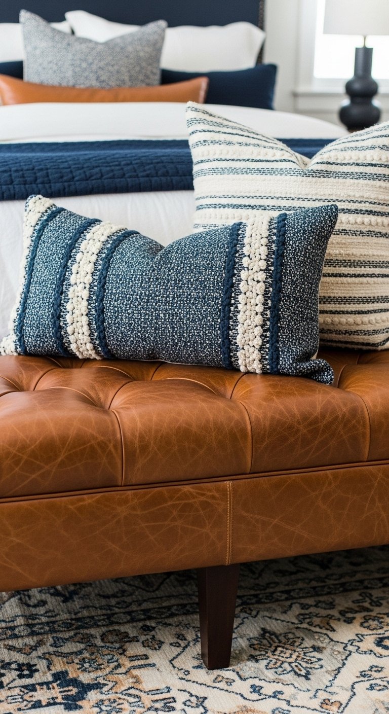 - Velvet: Adds depth and luxury (pillows, bench upholstery).