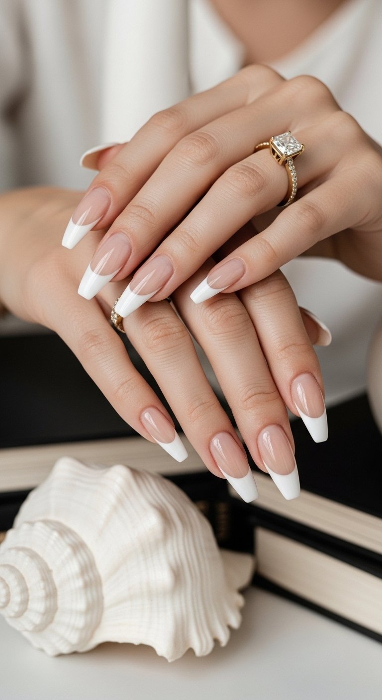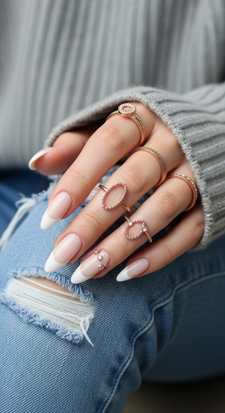 This style takes the traditional beige and white manicure and adds a gold chrome micro-line. You paint a standard white French tip first. Then, using a fine liner brush and gold chrome polish (or gold foil gel), you trace the line where the white meets the pink base. This “double French” effect adds a hint of jewelry to the nail without dominating the look. It requires a steady hand and a very thin brush. The gold line acts as a separator and highlights the precision of the manicure. It is subtle enough for conservative workplaces but detailed enough to show you care about style.