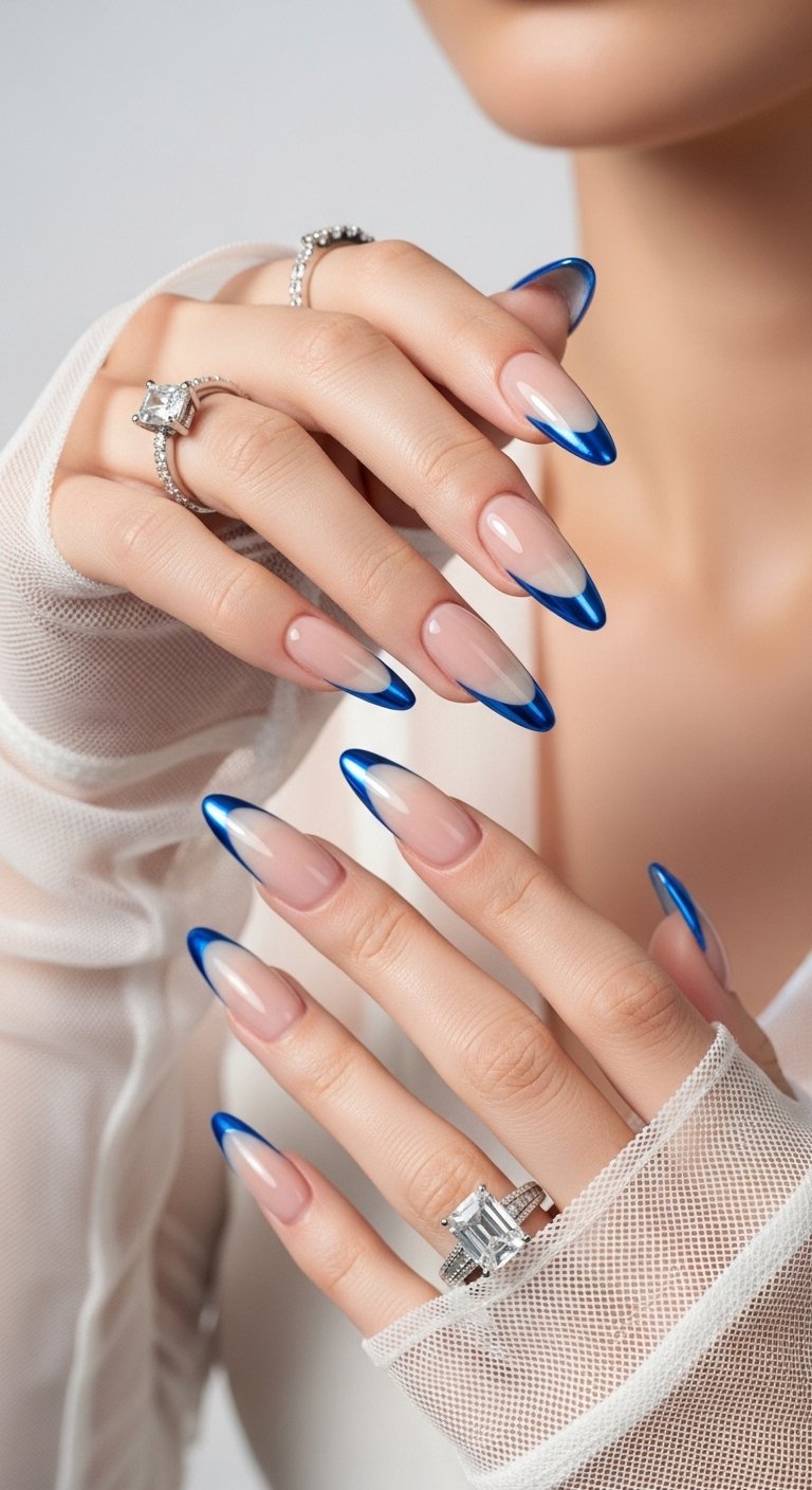 Electric blue chrome tips are for the bold. This is a high-visibility look that demands attention. The shade is often called “cobalt chrome.” It reflects light intensely and creates a harsh, clean line against a nude base. This style is often seen in streetwear fashion. You must ensure your cuticle work is immaculate because the bright blue will draw eyes to the entire nail area. A stiff square shape enhances the boldness of the color. To get this electric intensity, use a blue metallic foil transfer instead of powder for a brighter, more solid finish.