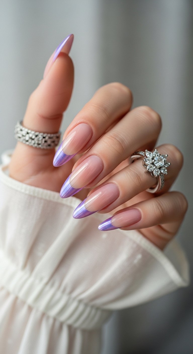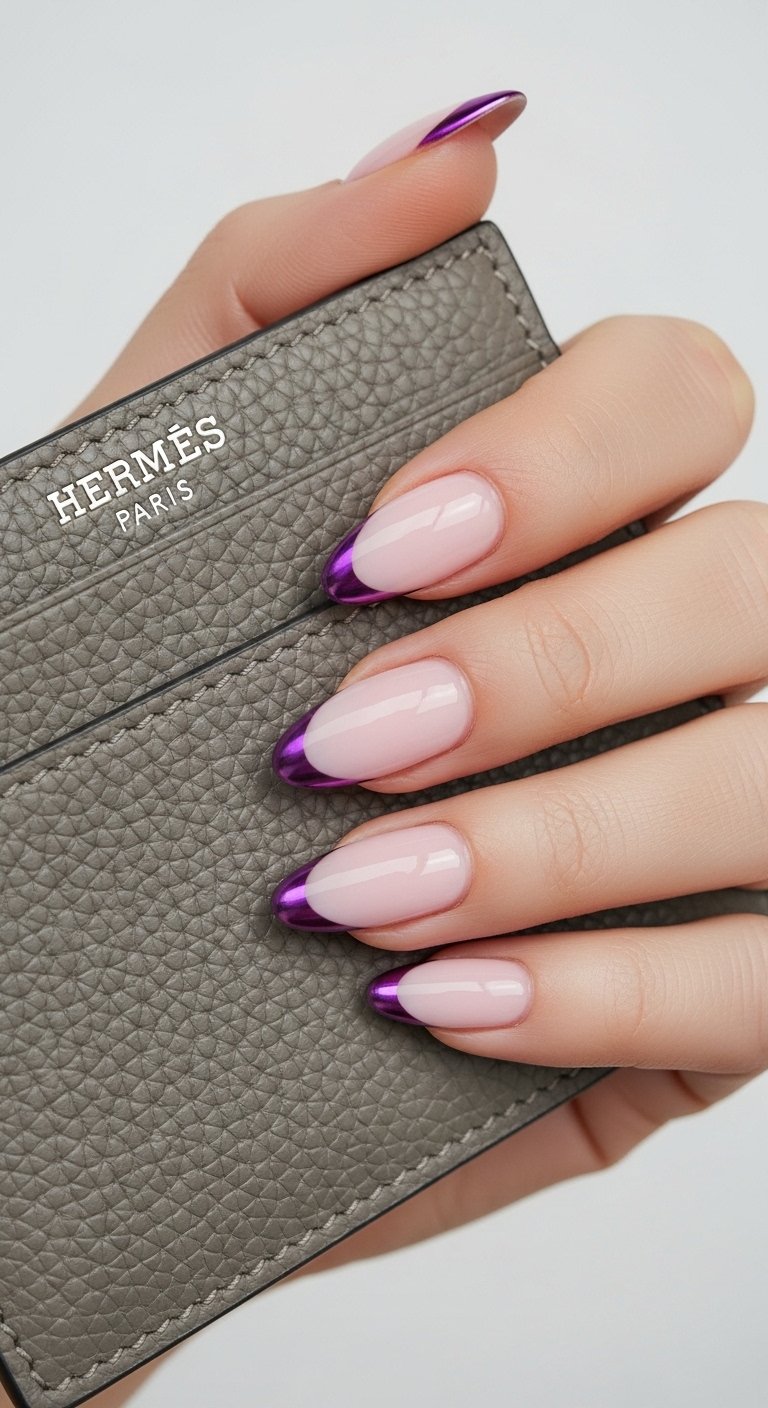 Lavender and lilac chrome tips bring a spring-like freshness to the hands. Purple is complementary to all skin tones because it contains both warm red and cool blue. A metallic purple tip on a sheer nude base looks sophisticated and floral. The chrome finish prevents the pastel purple from looking childish. You should opt for a “velvet” chrome effect here. You can achieve this by mixing the chrome powder with clear gel before applying it, giving it a textured depth. This style looks particularly striking on oval nails where the soft curve matches the soft color.