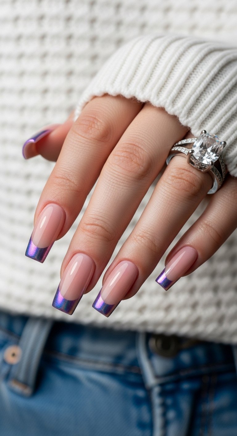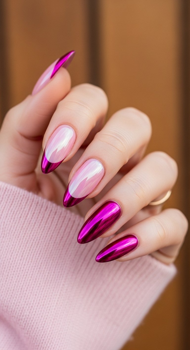 A solid pink chrome tip on a pale pink base creates a “tone-on-tone” masterpiece. This look utilizes a metallic hot pink or magenta powder for the French tip. The contrast comes from the texture difference between the creamy base and the metallic tip. It is playful yet structured. You need to ensure the smile line is deeply curved to exaggerate the feminine aesthetic. A deep smile line elongates the nail bed and makes the fingers look slender. This specific shade of pink chrome is often achieved by using a silver chrome powder over a hot pink gel polish base. The pink shines through the silver to create a metallic fuchsia.