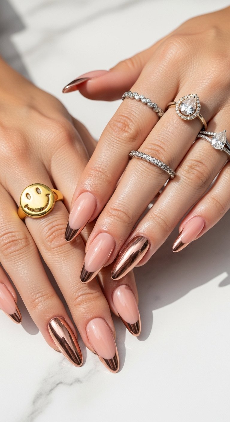 Gradient chrome techniques mimic the colors of a sunrise on your fingertips. This design blends gold and copper chrome powders at the tip, fading into a warm peach base. The visual analysis shows a soft ombre effect rather than a harsh line. You achieve this by tapping the chrome powder onto the tip and using a fluffy brush to drag it slightly down the nail bed. This dispersion creates the fade. The warmth of the copper and gold tones compliments olive and deep skin tones beautifully. It is a less severe take on the metallic trend and feels organic and fluid. This style is perfect for summer months or vacation wear.