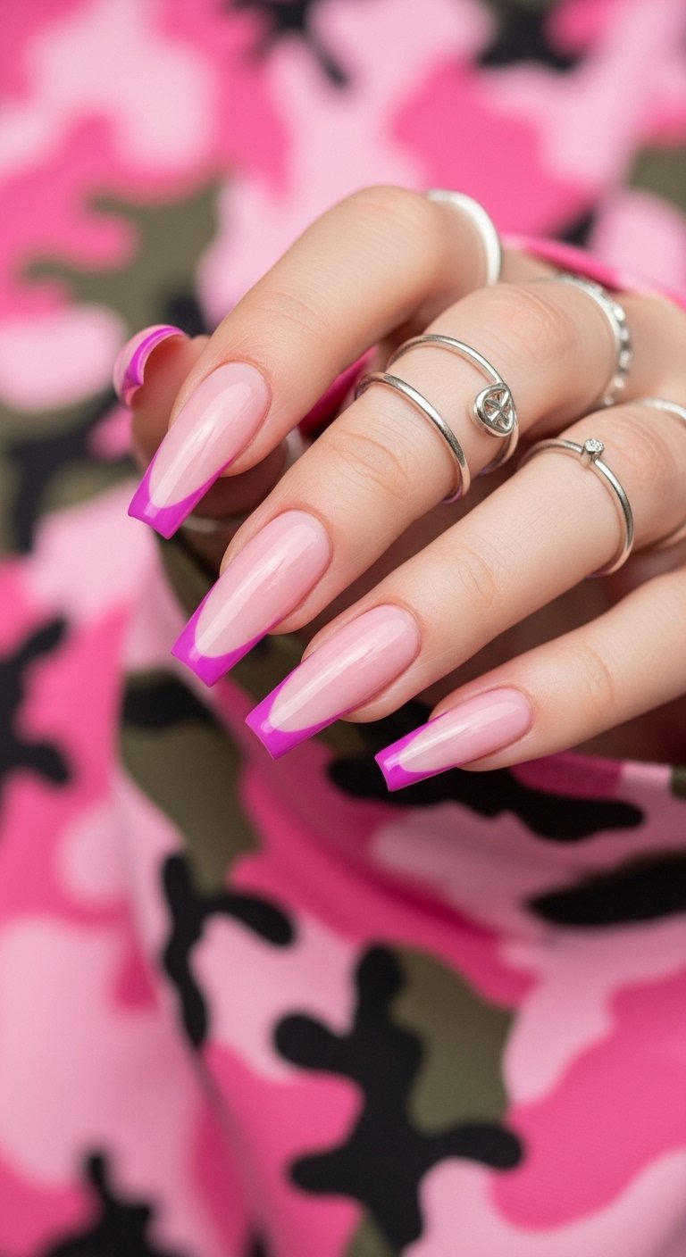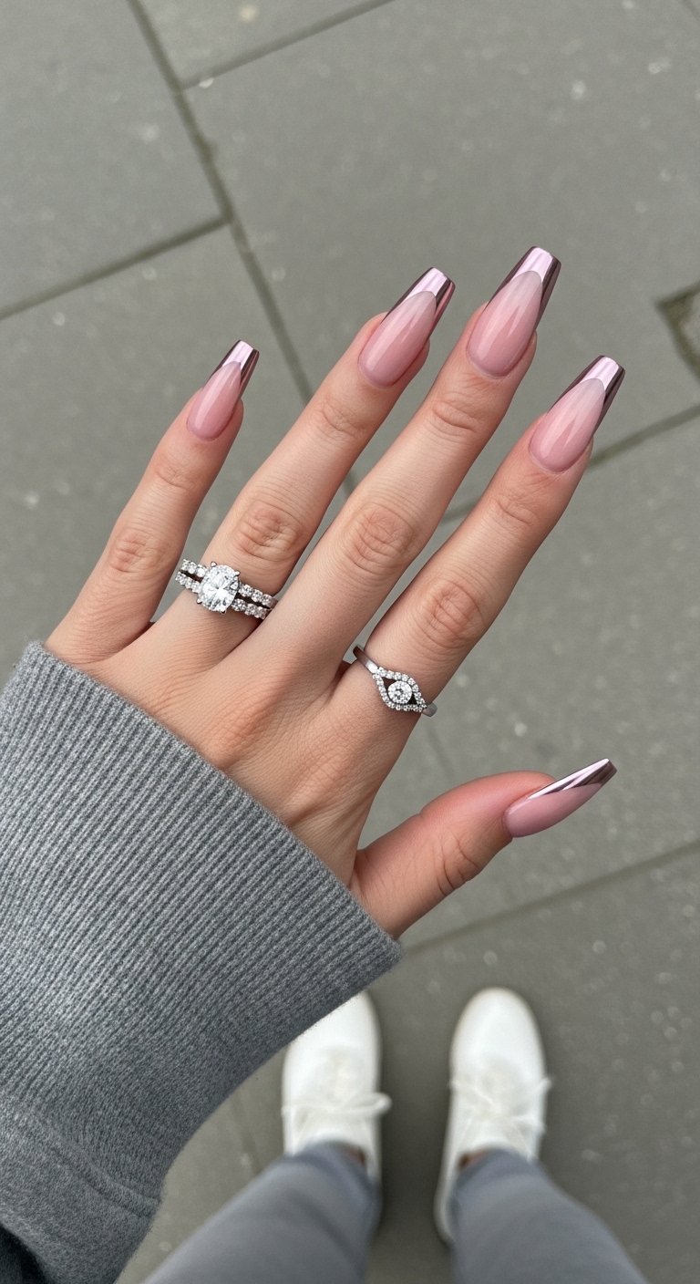 Silver chrome tips on a cool-toned nude base define the futuristic “cool girl” aesthetic. This style utilizes a true mirror chrome powder that reflects images clearly. The design relies on the coolness of the silver to create a clean and sterile look that feels high-fashion. You should pair this with a coffin or long square shape to maximize the reflective surface area of the tip. The application requires a black gel base on the tip underneath the silver powder to make the chrome pop with maximum intensity. Without the black underpainting, the silver may look sheer or washed out. This high-impact style is a favorite for concerts and festivals.
