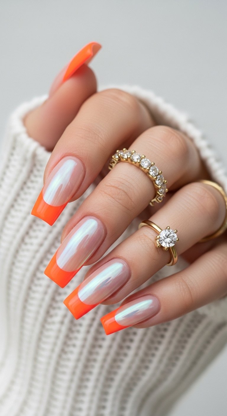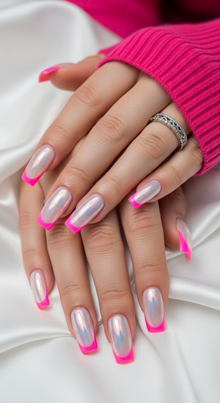 This high-energy style combines bright neon tips with a translucent chrome overlay. The visual effect is electric. You paint the French tip in a neon green, pink, or yellow gel. After curing, you apply a sheer iridescent chrome powder over the entire nail. The chrome creates a unifying shimmer that tones down the harshness of the neon while adding a futuristic glow. This is a problem-solving design for those who love neon but need it to look slightly more refined for daily wear. The chrome layer acts as a filter. It softens the neon pigment and adds a complex light reflection that changes as you move your hand.