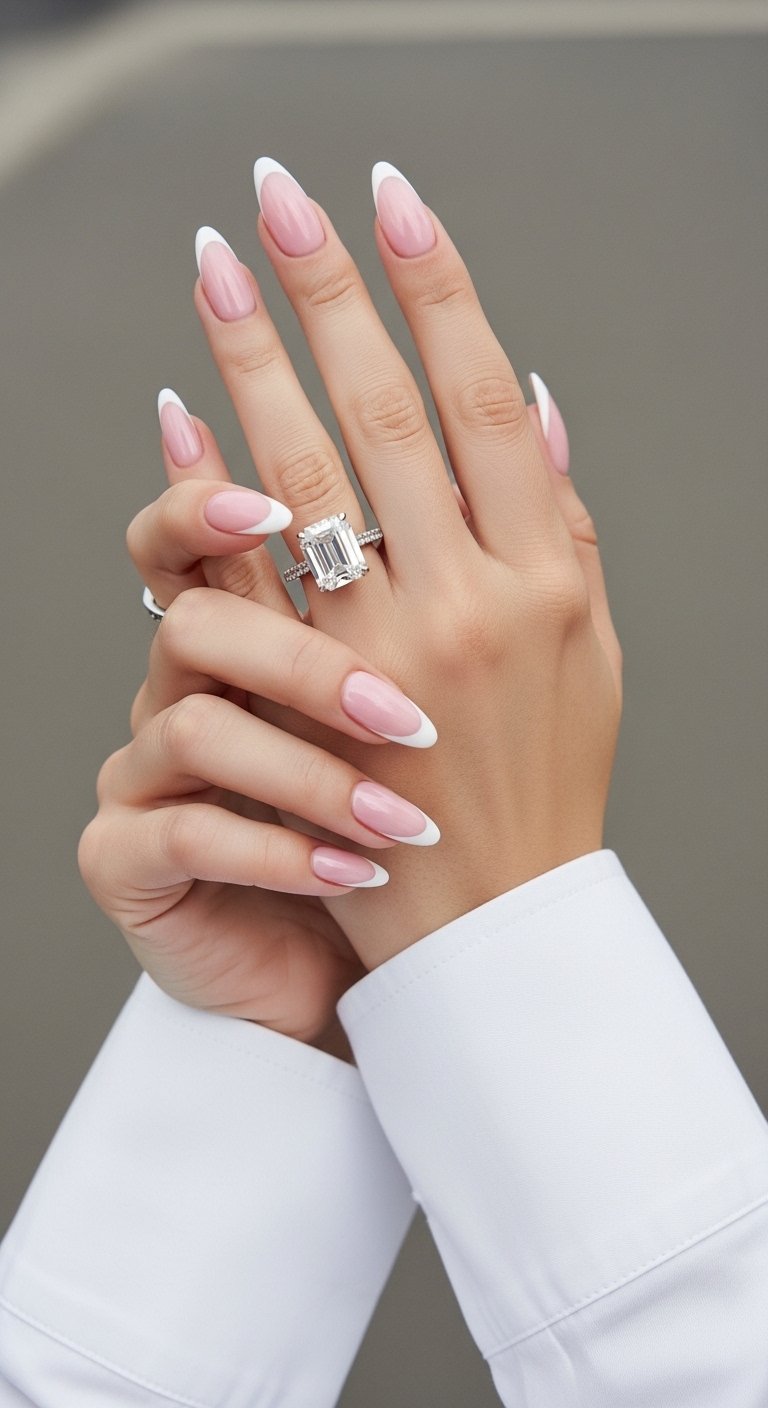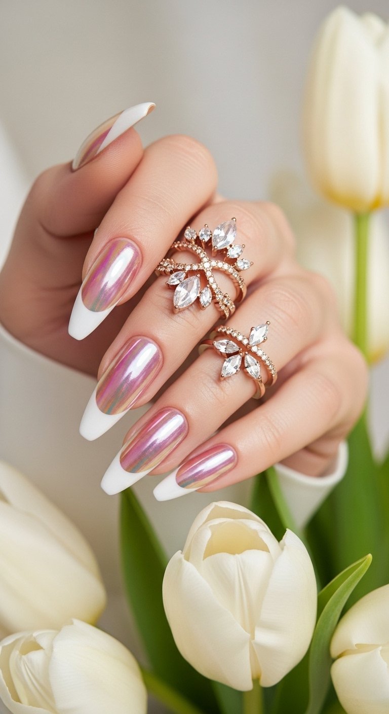 This design is the most subtle entry in the list. It features a pale pink chrome tip on a white milky base. This reverses the traditional color placement. The white base provides a bright, clean canvas, while the pink chrome tip adds a soft flush of color. It mimics the look of rose quartz. This style is excellent for those with shorter nail beds as the white base brightens the entire hand. You apply a milky white builder gel for opacity and structure. The pink chrome is dusted lightly onto the free edge. The result is ethereal and dreamy.