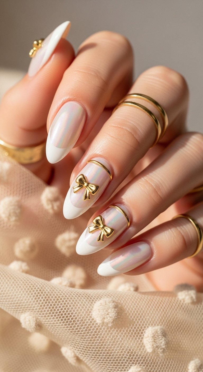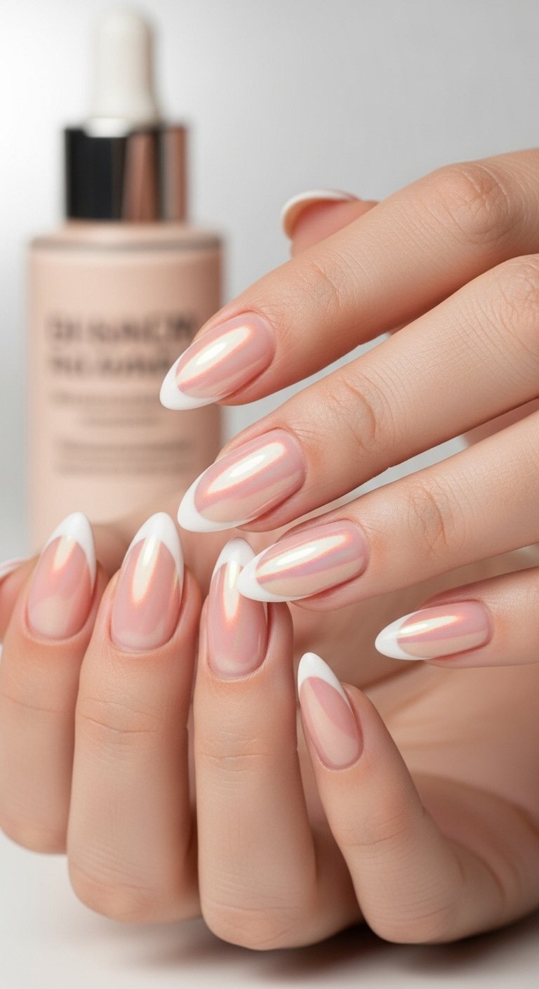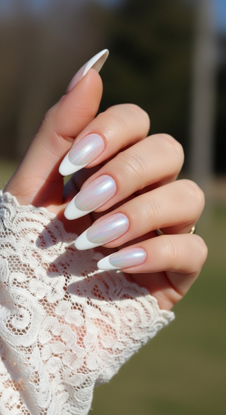 The “Pearl Chrome” differs from standard silver by having a warmer, yellow-pink shift. It mimics the nacre of a real pearl. This is the ultimate bridal nail for 2024. The almond shape is essential here as it mimics the shape of a pearl drop. You apply the pearl powder over the entire nail, but you concentrate a second layer on the tip to create a subtle gradient. It creates a “your nails but better” effect. It glows rather than sparkles. This style hides regrowth lines very well, making it a practical choice for long vacations.