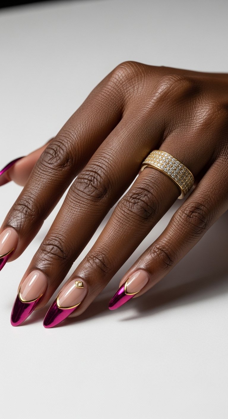 Fuchsia is a deep, purplish-red that exudes confidence. A fuchsia chrome tip is a power move. It is darker than pink but brighter than burgundy. This color looks incredible with black clothing. The chrome finish gives the fuchsia a depth that looks like anodized aluminum. You apply this on a beige base that matches your skin tone exactly. The goal is to make the tip look like it is floating. The deep saturation of fuchsia covers the free edge of the nail completely, hiding any discoloration of the natural nail.