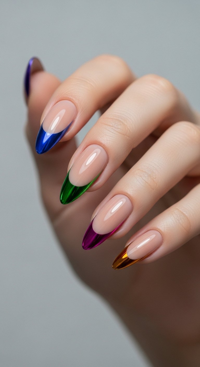 Why choose one color when you can wear them all? Rainbow chrome tips assign a different metallic shade to each finger. Thumb is pink, index is orange, middle is yellow, and so on. The unifying factor is the chrome finish. It ties the disparate colors together into a cohesive look. You keep the base nude to avoid chaos. This is a celebratory style often worn during Pride month or summer festivals. It requires owning a palette of chrome powders. You can buy “chrome palettes” that look like eyeshadow palettes to save money on buying individual jars.