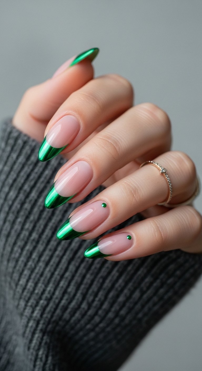 Sage green or emerald green accents modernize the chrome look. You start with a full silver or pearl chrome nail. Then, you add a micro-French tip in green. The metallic base reflects the green tip, creating a double-vision effect. The green connects the manicure to nature and organic trends. This works beautifully with the “clean girl” aesthetic which favors neutrals and greens. The green paint should be a highly pigmented gel to cover the chrome base effectively.