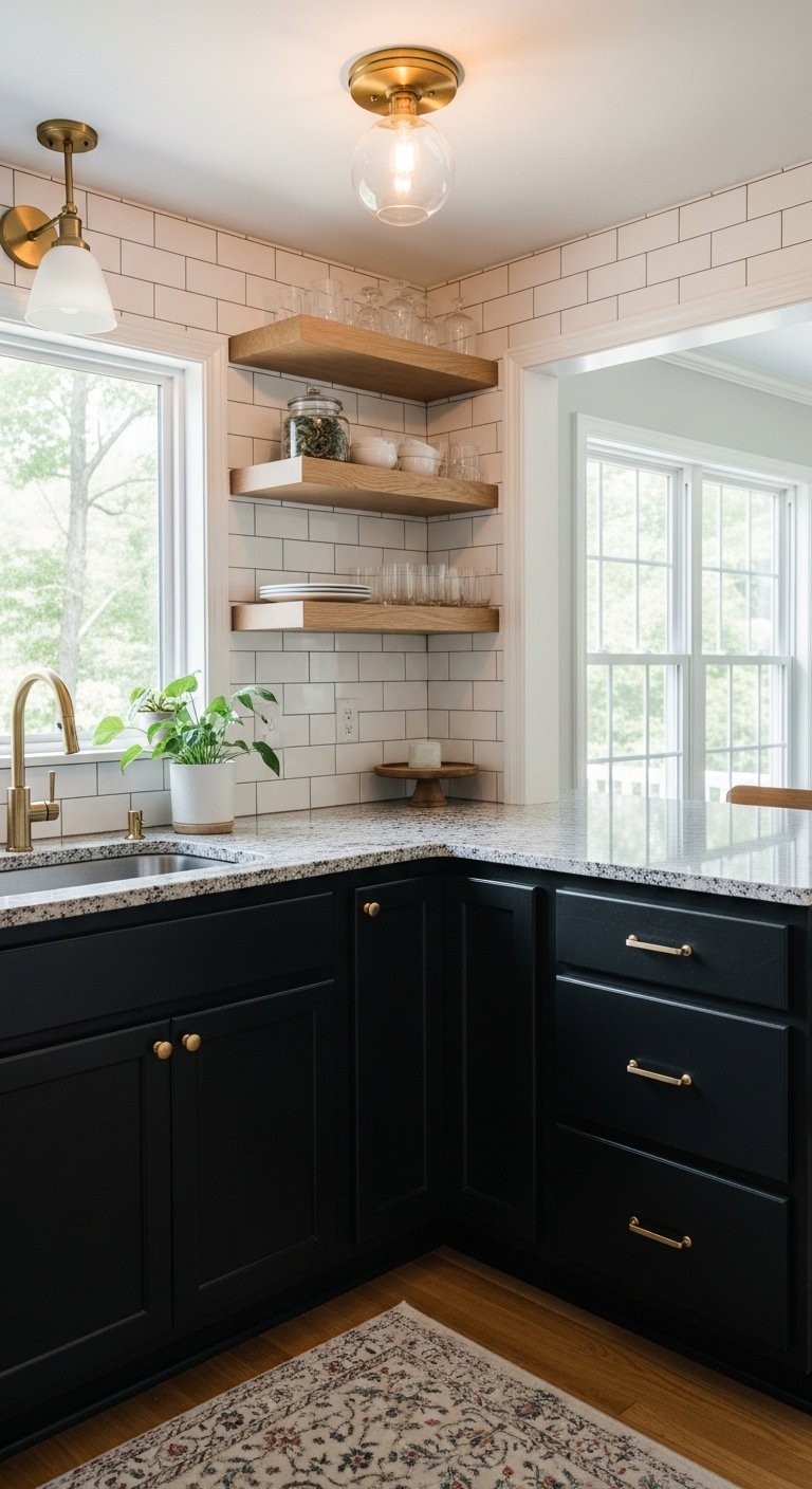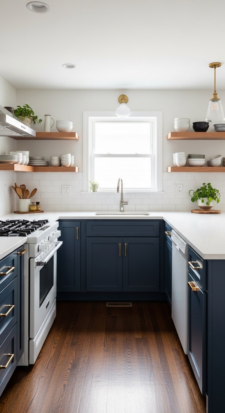 Brass or gold hardware pops brilliantly against a dark background. The contrast creates a jewelry-like effect that feels luxurious. You should ensure adequate lighting exists to prevent the room from becoming a cave. Under-cabinet lighting becomes essential to keep workspaces functional and bright.