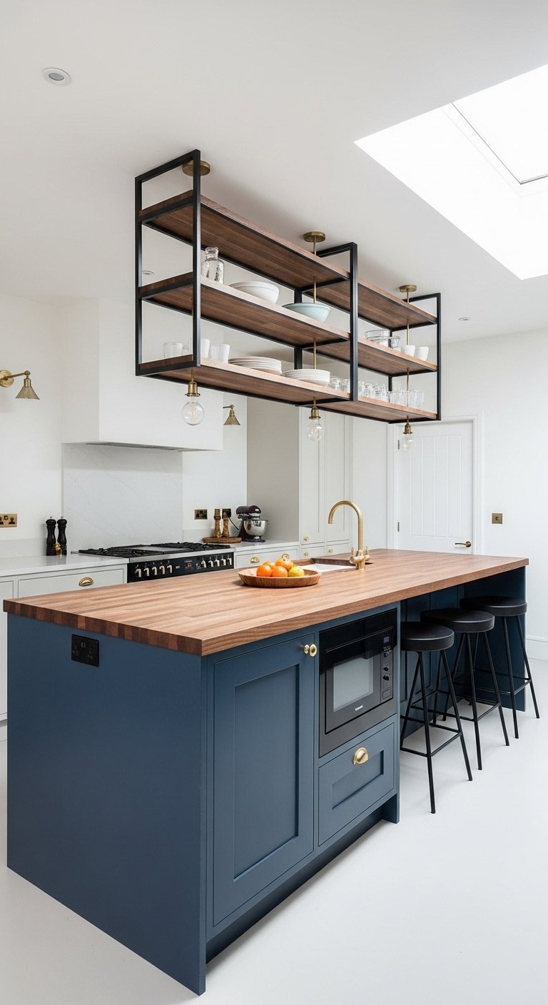 If full cabinets feel too heavy, use open shelving for the top section. A library ladder adds functionality and a unique design feature for high ceilings. Utilizing vertical space keeps the countertops clear of clutter. It turns the walls into a powerhouse of organization.