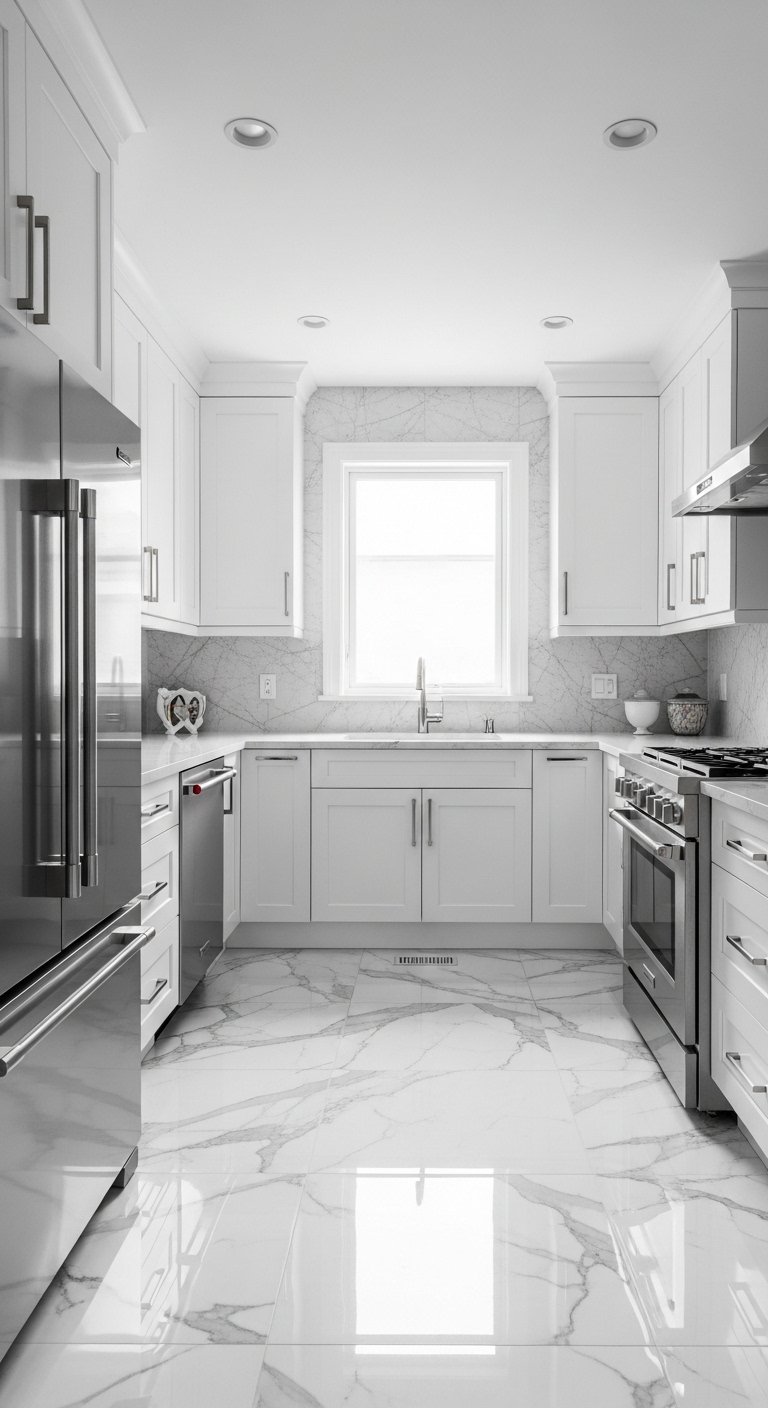 White tile brightens the shadow-prone corners of a U-shaped kitchen. It feels crisp and professional. The affordability of ceramic white tile makes it a budget-friendly choice that looks high-end. It provides texture without overwhelming the visual senses.