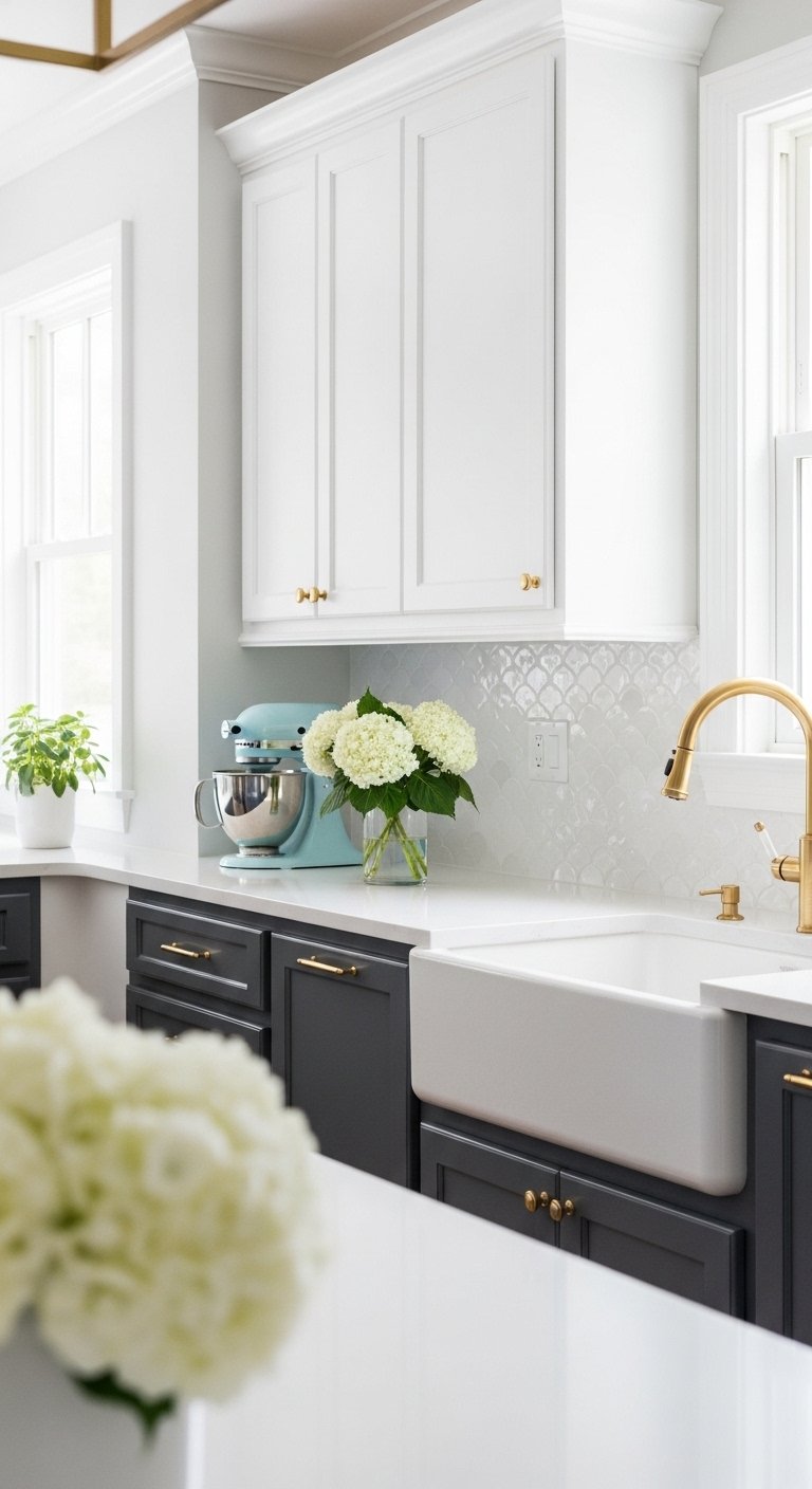 Keep the hardware finish consistent across both cabinet colors to tie the look together.