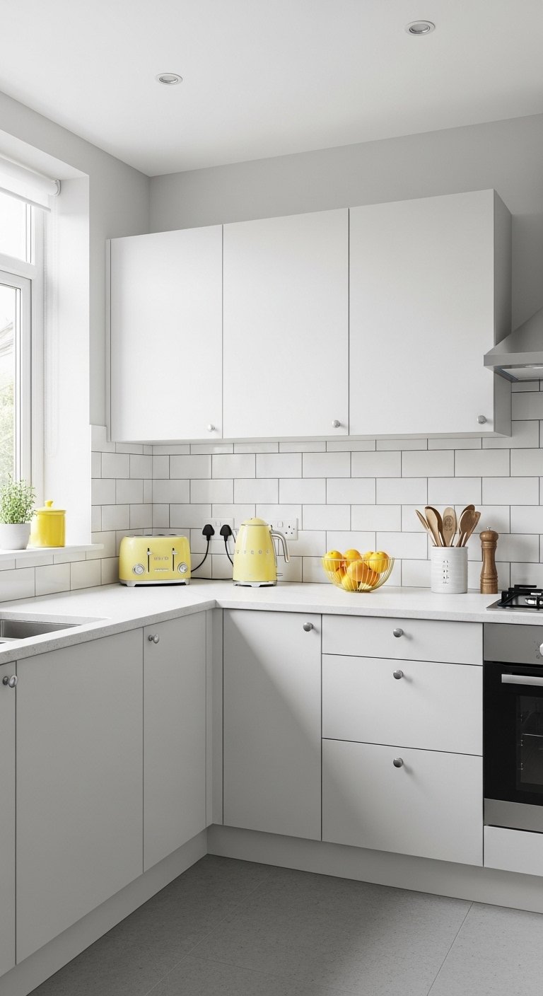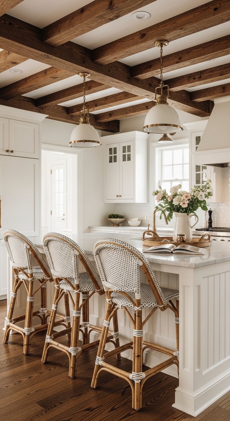 Even small doses of wood make a difference. Bar stools with wooden legs, butcher block countertops, or bamboo blinds add necessary softness. The grain patterns in wood provide a subtle visual interest that solid colors lack. This material connects the kitchen to nature and creates a cozy atmosphere.