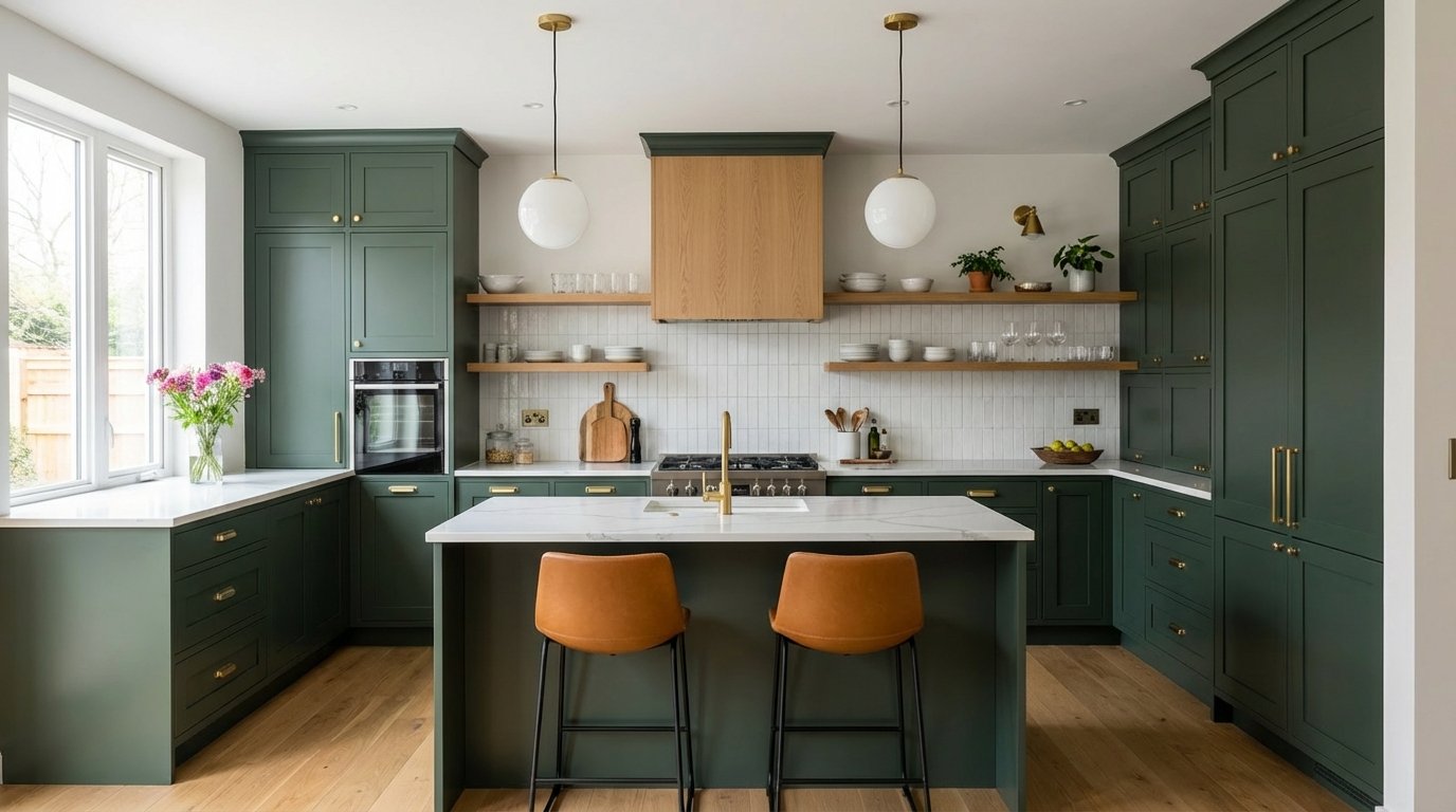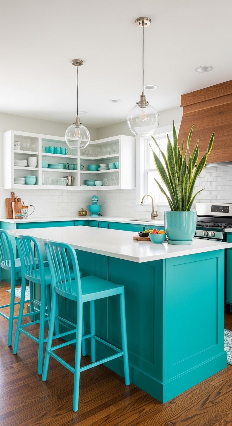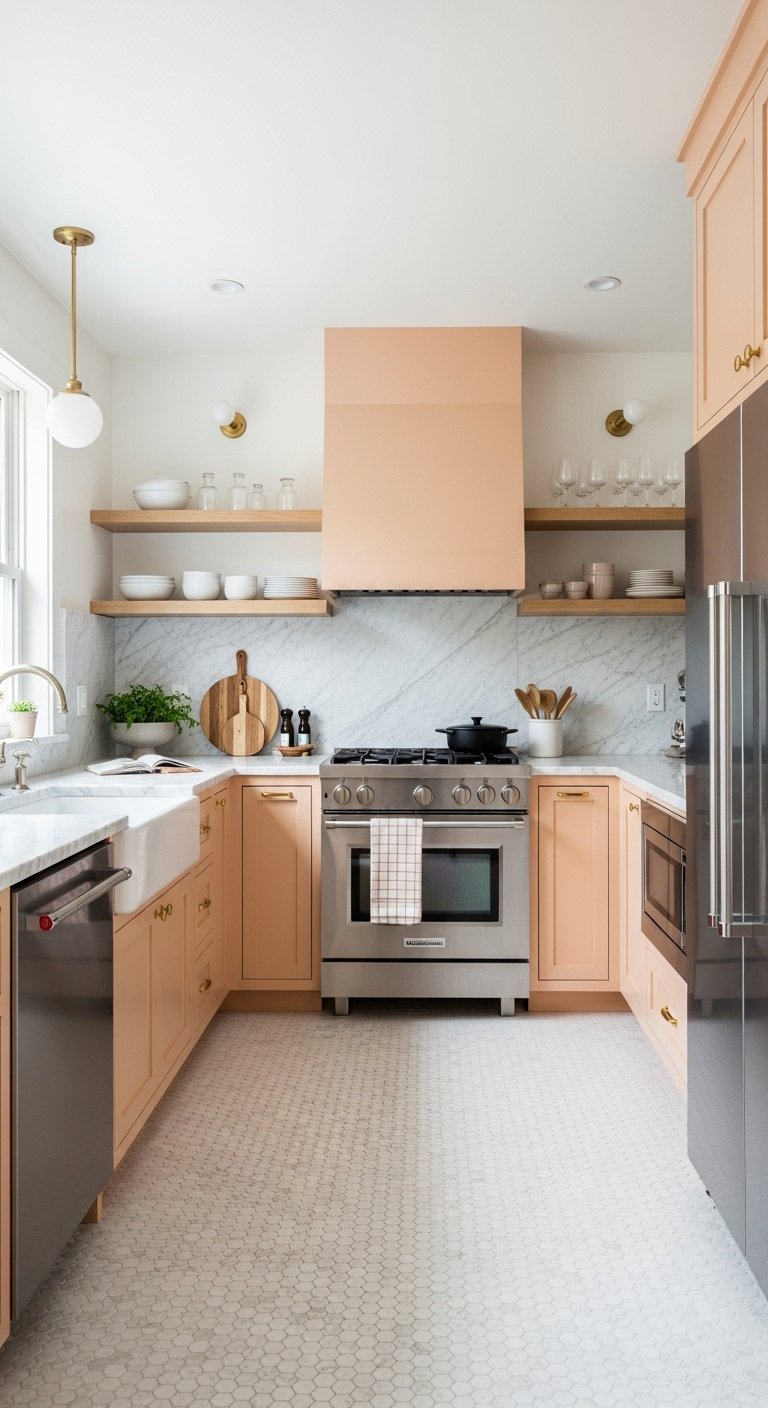 Neutral kitchens are safe, but colorful kitchens are memorable. Deep blues, sage greens, or even terracotta pinks bring life to a U-shaped kitchen. Painting the cabinetry a bold color transforms the room into a statement piece. You can balance bold cabinets with white walls and countertops.