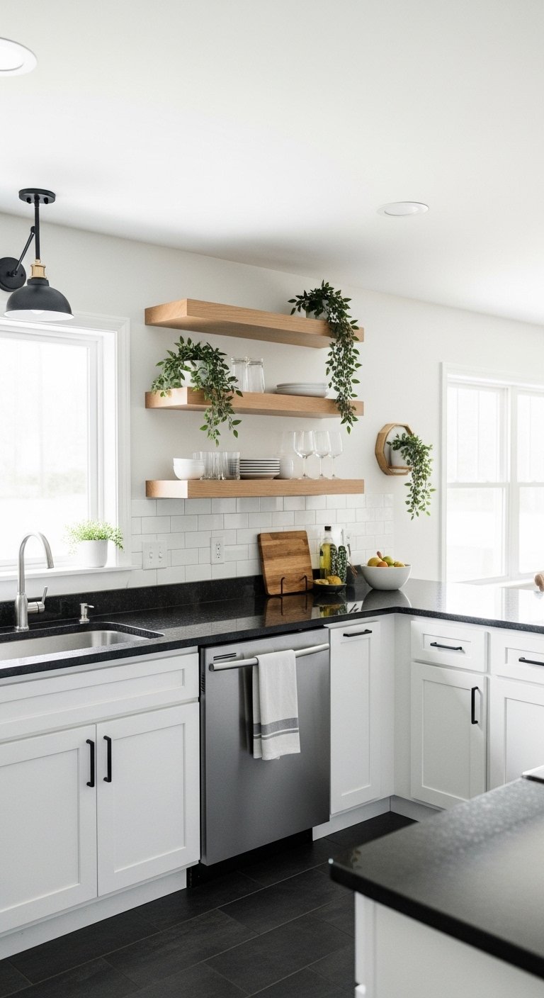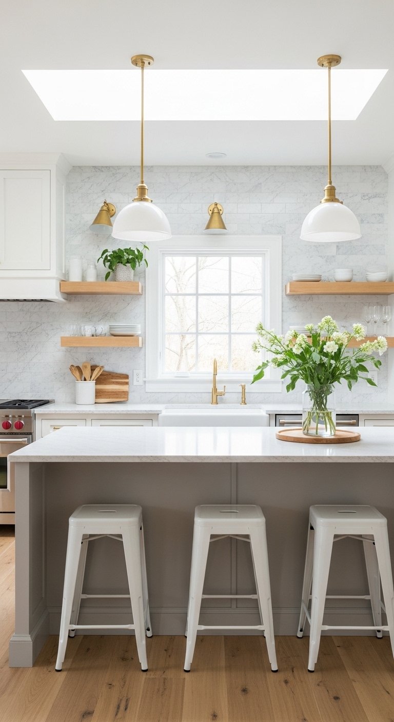 All-white kitchens can sometimes feel sterile or cold. Wood elements introduce organic texture and natural warmth instantly. You might choose white oak lower cabinets paired with painted uppers for a grounded, earthy feel. Floating wood shelves break up a wall of tile and add accessible storage.