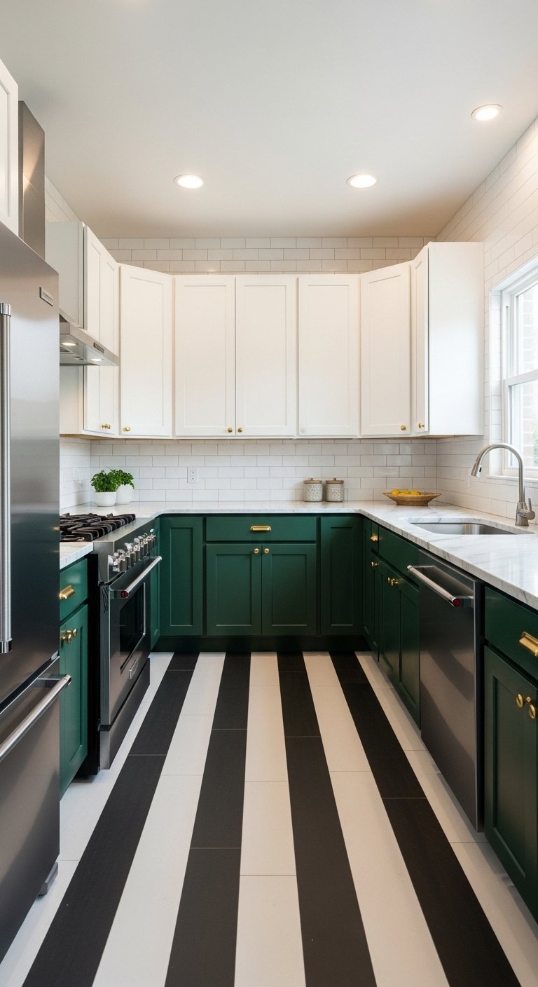 If you prefer wood, laying planks in a herringbone pattern adds sophistication and movement. The direction of the flooring can guide the eye into the kitchen. A bold floor allows you to keep cabinets and walls neutral. It creates a “wow” factor the moment you step into the U.
