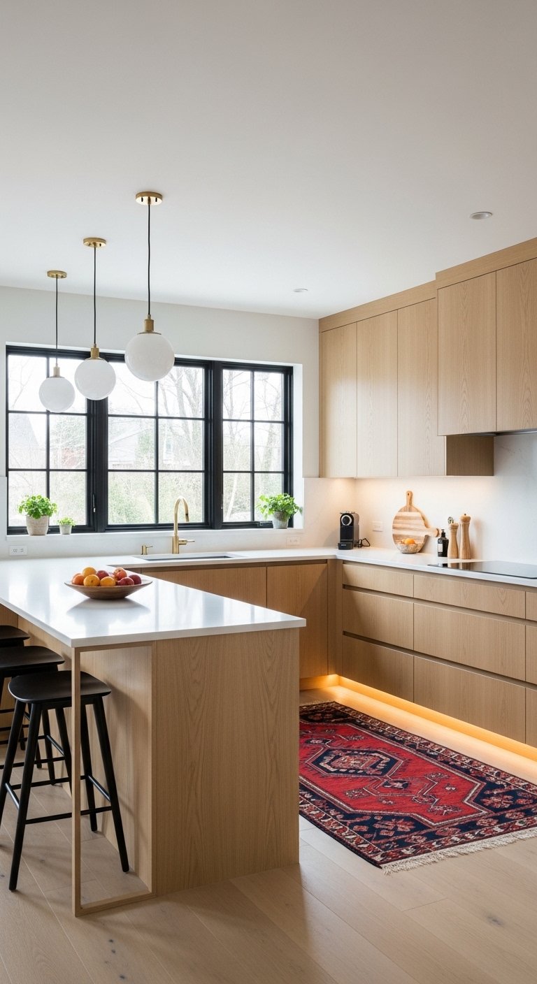 Kitchens deserve personality just like living rooms. You can soften the hard edges of cabinetry and appliances with thoughtful decor. A vintage runner rug adds color and comfort underfoot while guiding the eye through the U-shape. Open shelves offer a place to display beautiful ceramics, cookbooks, or plants.