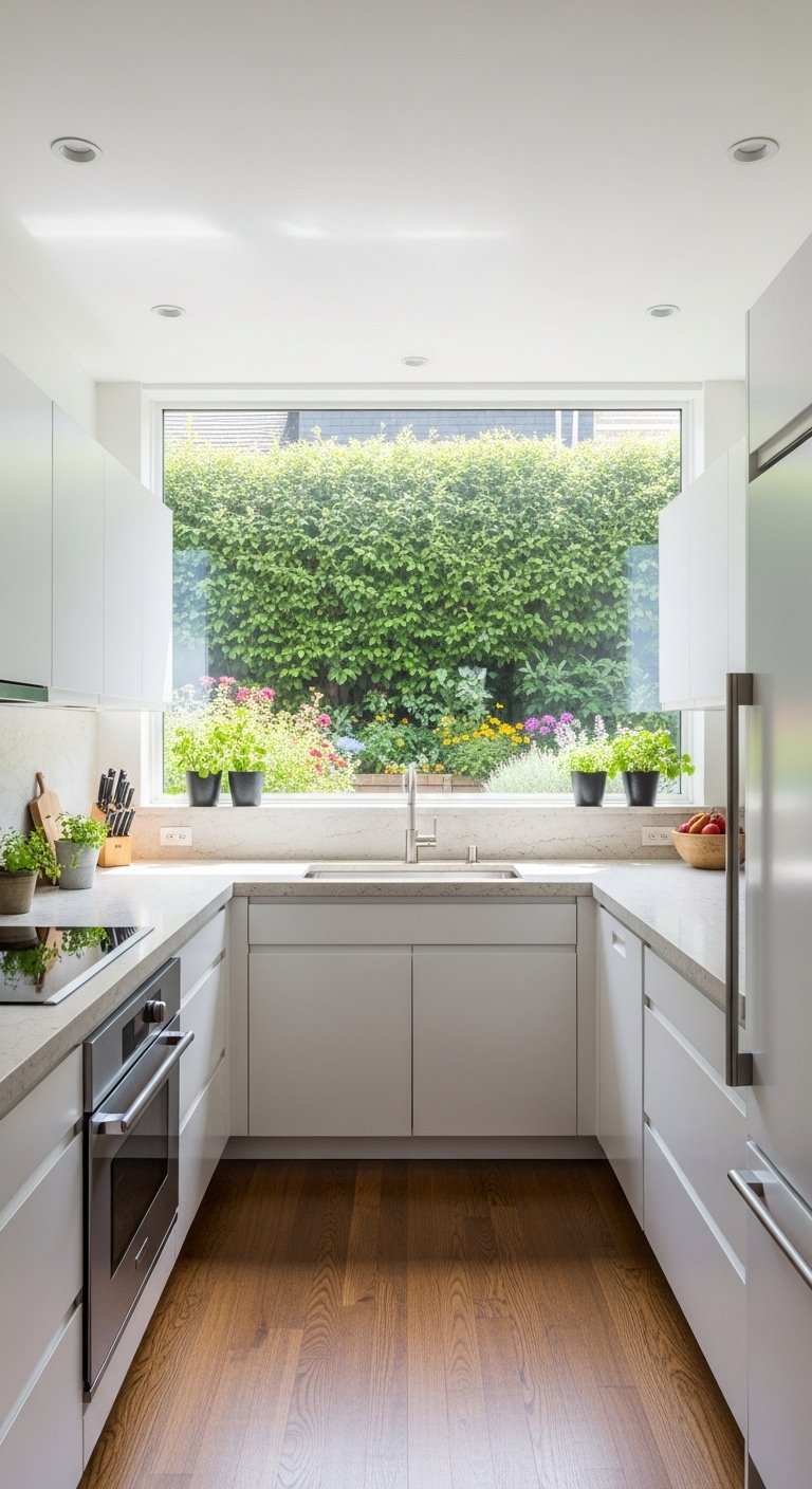 Placement of the sink under a window is a classic design move for a reason. It provides natural light for washing dishes and prepping food. It gives the cook a view of the outdoors, reducing the feeling of being stuck in a box. In a U-shaped layout, the window naturally becomes the central anchor point.