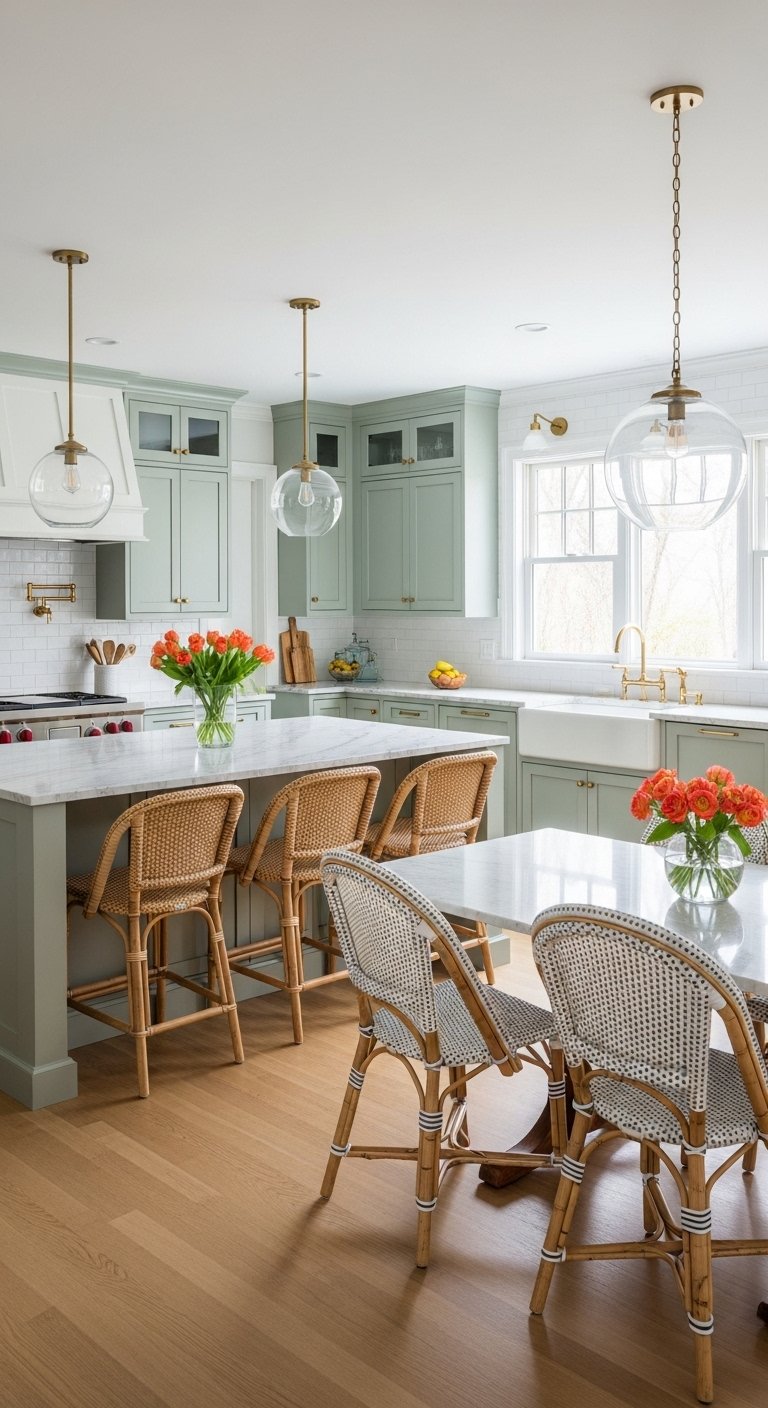 • Lighting: Opal glass globe pendants or brass sconces.