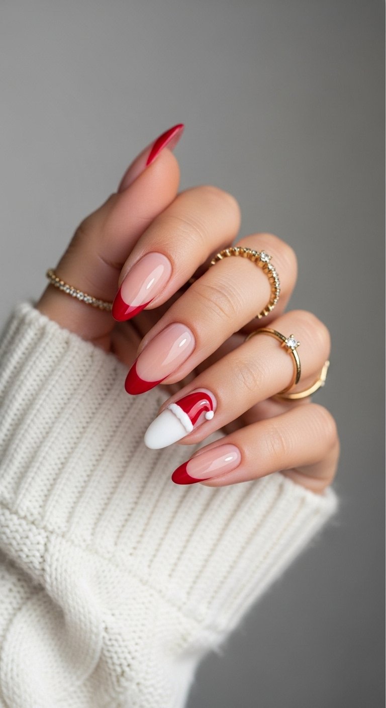 This is a whimsical take on the French manicure. You paint the tip of the nail red. You add a line of white fuzz at the smile line and a white pom pom on one side of the tip. It transforms the French tip into a tiny Santa hat. This works best on almond or stiletto shapes where the curve mimics the hat’s flop.