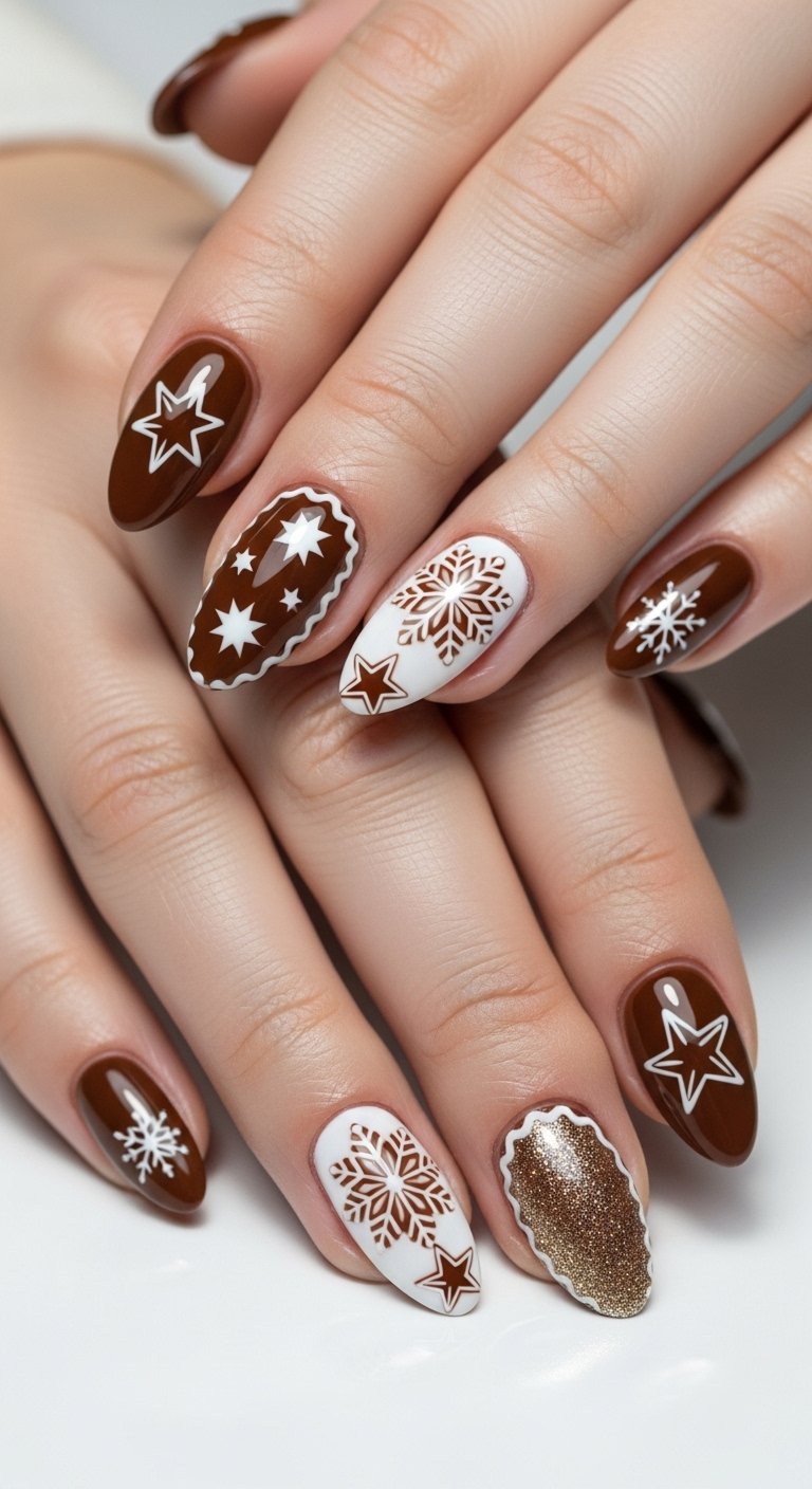 Brown nails provide the perfect canvas for gingerbread art. You paint the nails a warm cookie brown. On one nail you draw a tiny gingerbread face or body. You use white for the icing details and red/green for buttons. The warm brown tone is neutral yet festive.