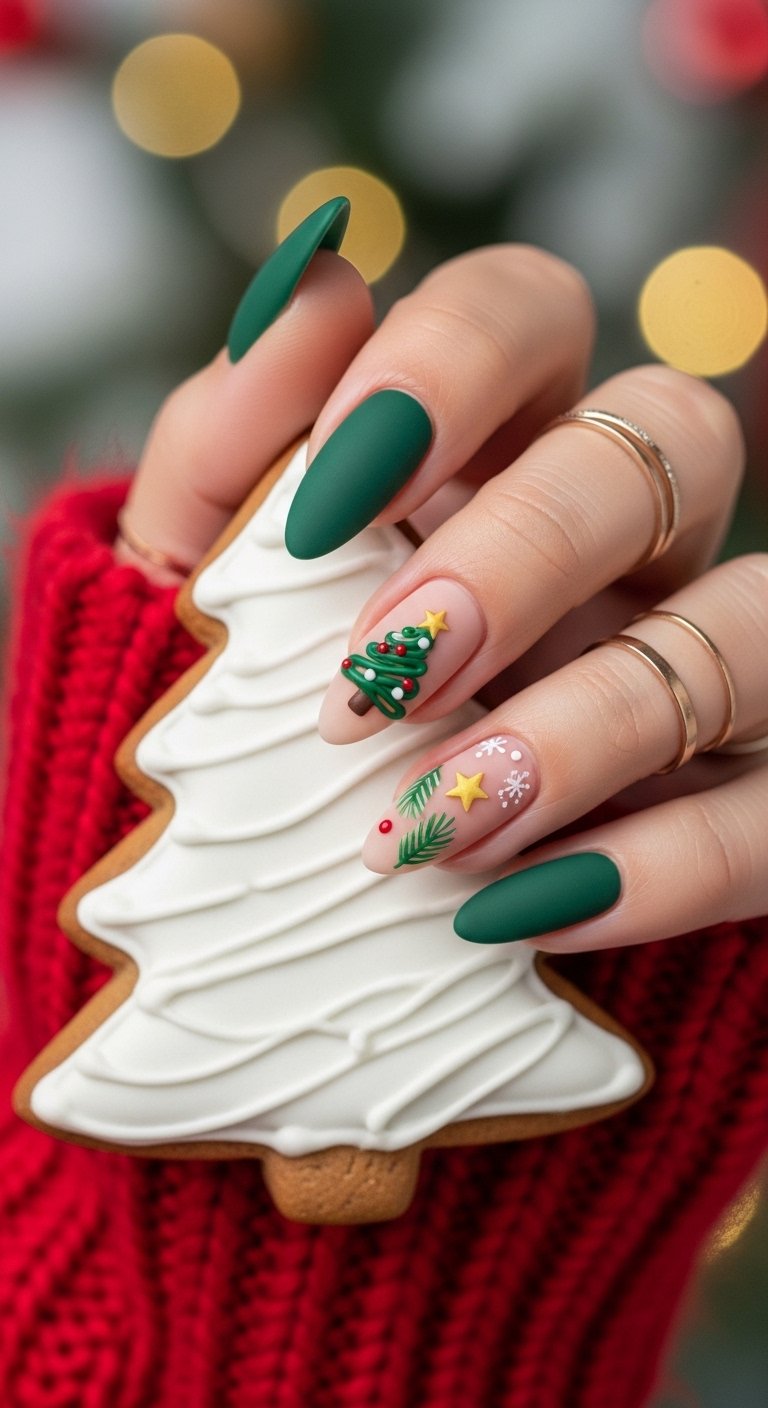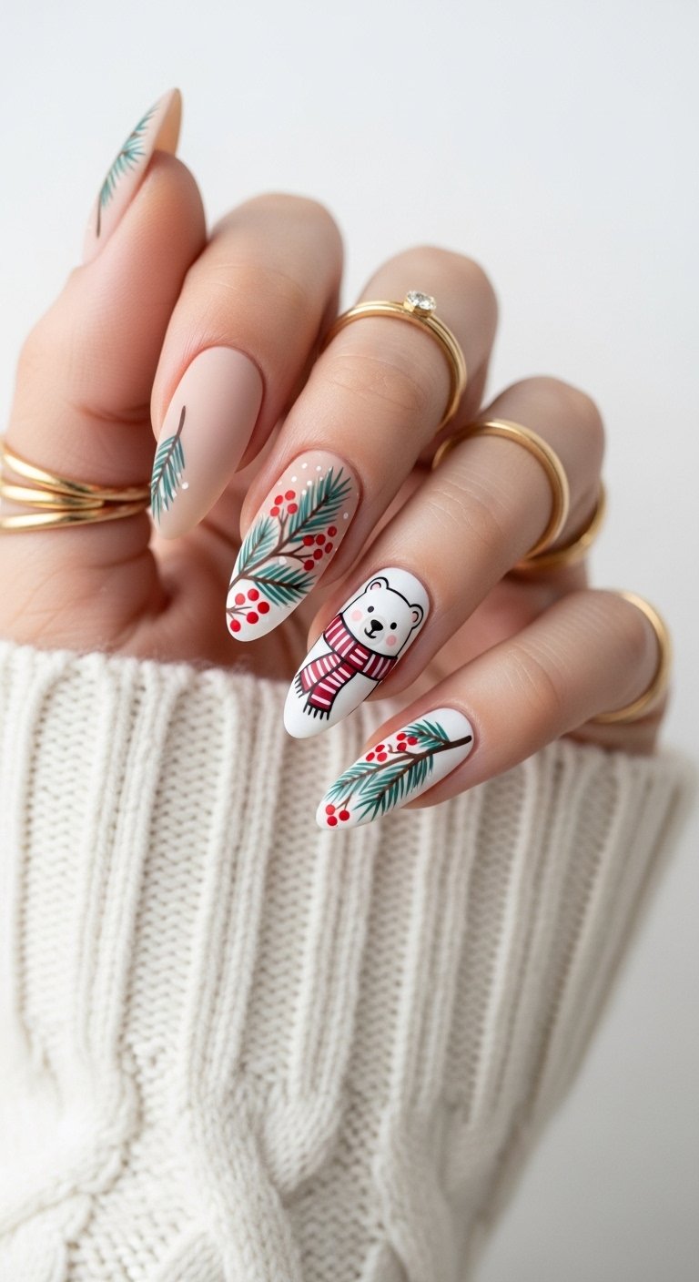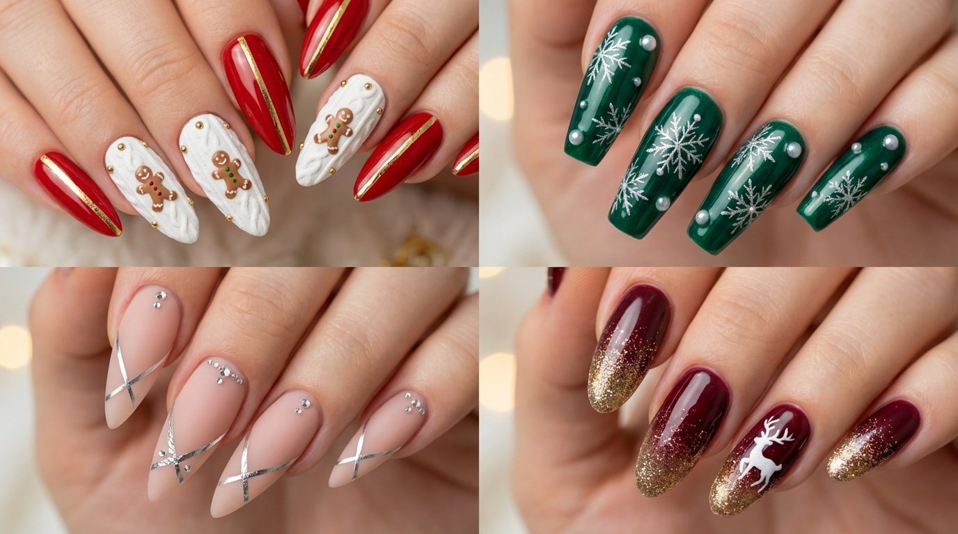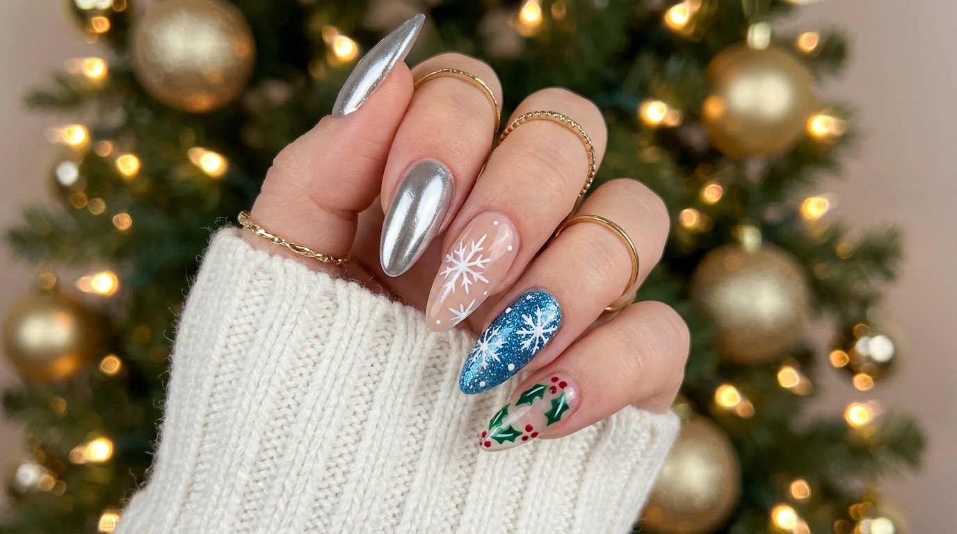 The biggest trends right now are “minimalist micro-art” and “textured finishes.” People are moving away from busy, cluttered designs. Instead, they prefer nude nails with tiny festive accents like a single snowflake or a thin red tip. Also, textured nails like sweater knits or velvet cat-eye polishes are very popular because they add depth without needing crazy colors.