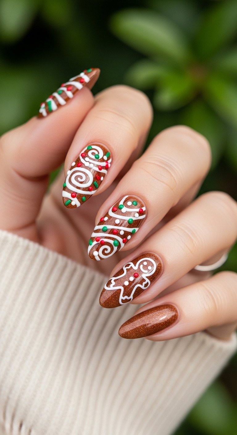 The gingerbread motif is cute without being loud. The brown color matches many winter outfits. It feels earthy and grounded. You can use a matte top coat to mimic the texture of a baked cookie. This design evokes the scent of spices and the warmth of the kitchen.