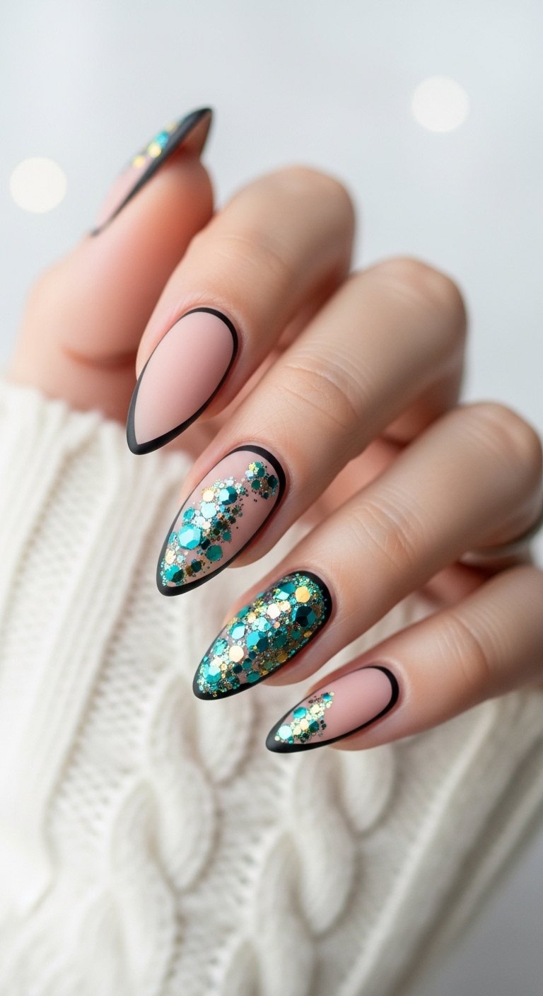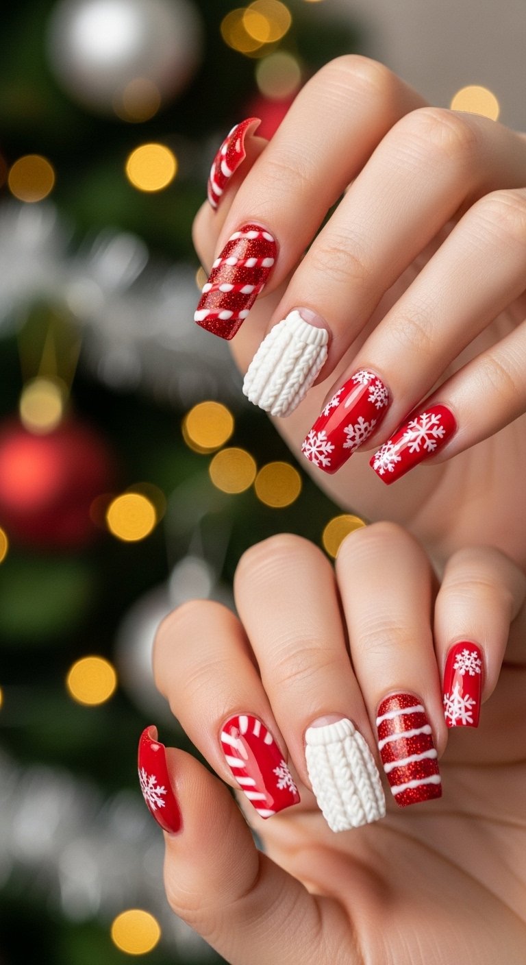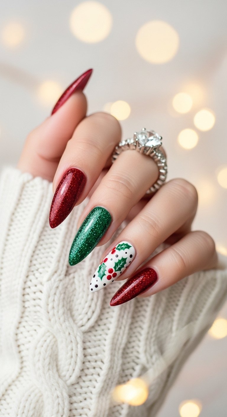 The sharp lines create order. The glitter adds the festive party vibe. This design is architectural. It works well on square nails where the geometry mimics the nail shape. It is a modern take on the traditional colors.