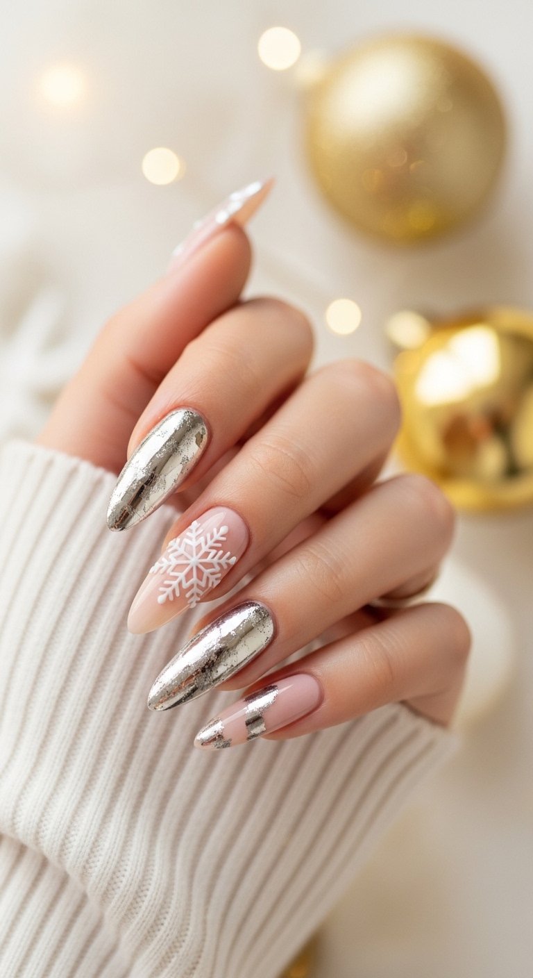 You achieve this by mixing clear polish with a drop of white. After curing or drying you rub a white chrome powder over the surface. The friction creates the mirror like shine. This is less opaque than the pearl finish. It allows the natural white free edge of your nail to show through slightly. It fits the “icy” winter theme without being literal snow art.