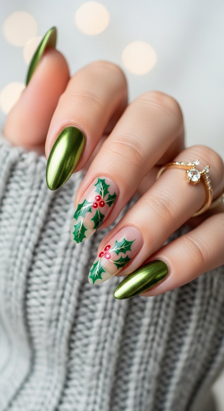 Holly leaves usually require intricate detailing. This version simplifies the motif into three dots. You place two green dots near the cuticle or corner and one red dot sitting atop them. It mimics the shape of holly berries without the need for drawing jagged leaves. This approach fits the minimalist trend perfectly by implying the shape rather than defining it.