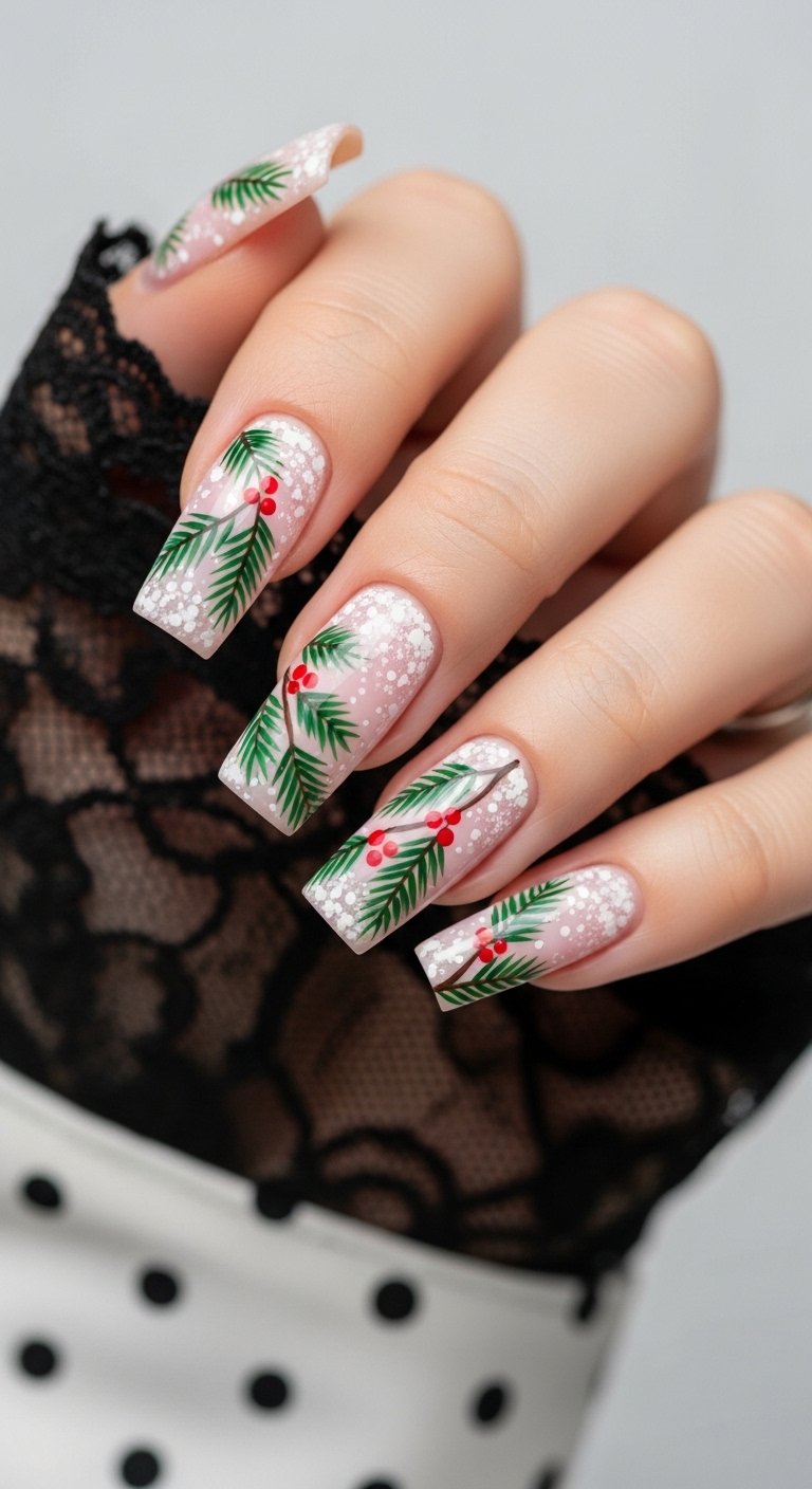 Detailed holly berries painted on a clear or white base scream Christmas. You use two shades of green for the leaves to add depth. The bright red berries pop against the green. You can place them at the cuticle for a “cuff” look.