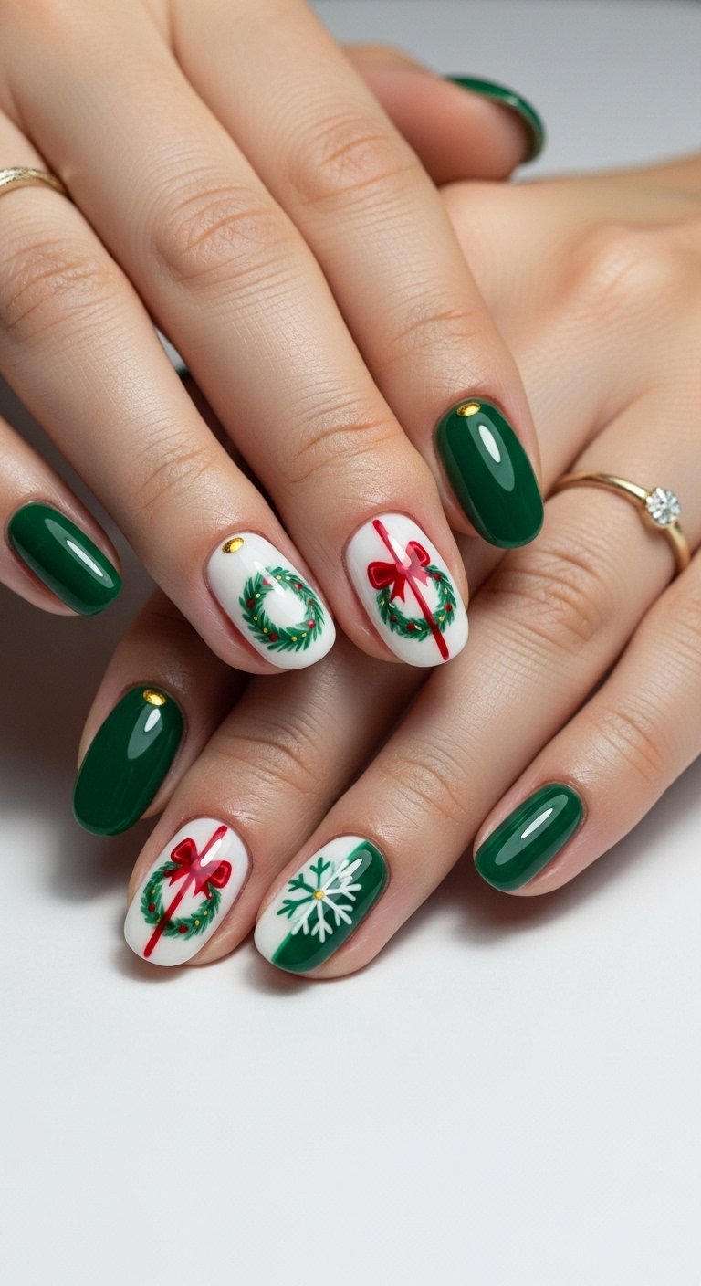 Instead of a white French tip you paint a green wreath curve. You add tiny red dots for berries. The wreath creates a semi circle frame for the end of the finger. It is delicate and detailed.