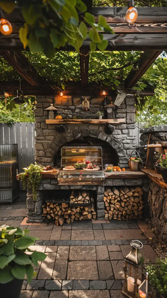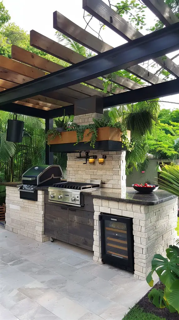 Soften the hard lines of a grill station with a living wall. Behind the grill, install a trellis or a vertical planter system filled with herbs like basil, rosemary, and thyme. Not only does it look lush and green, but it is also practical—you can pick fresh herbs and throw them directly onto the grill. This design works exceptionally well in small urban courtyards where ground space is limited. The greenery improves air quality and adds a refreshing scent to the cooking area.