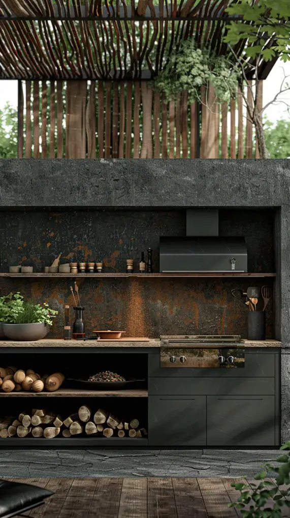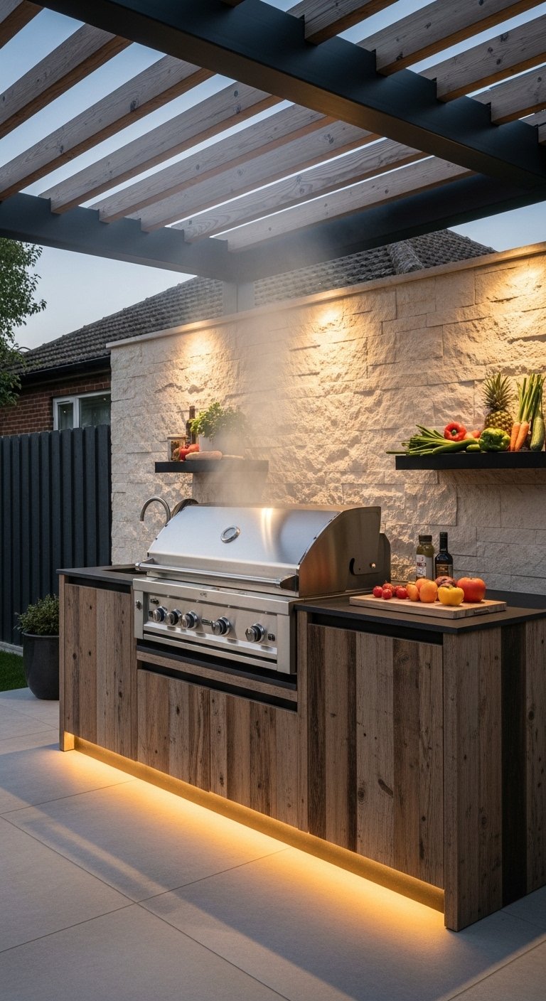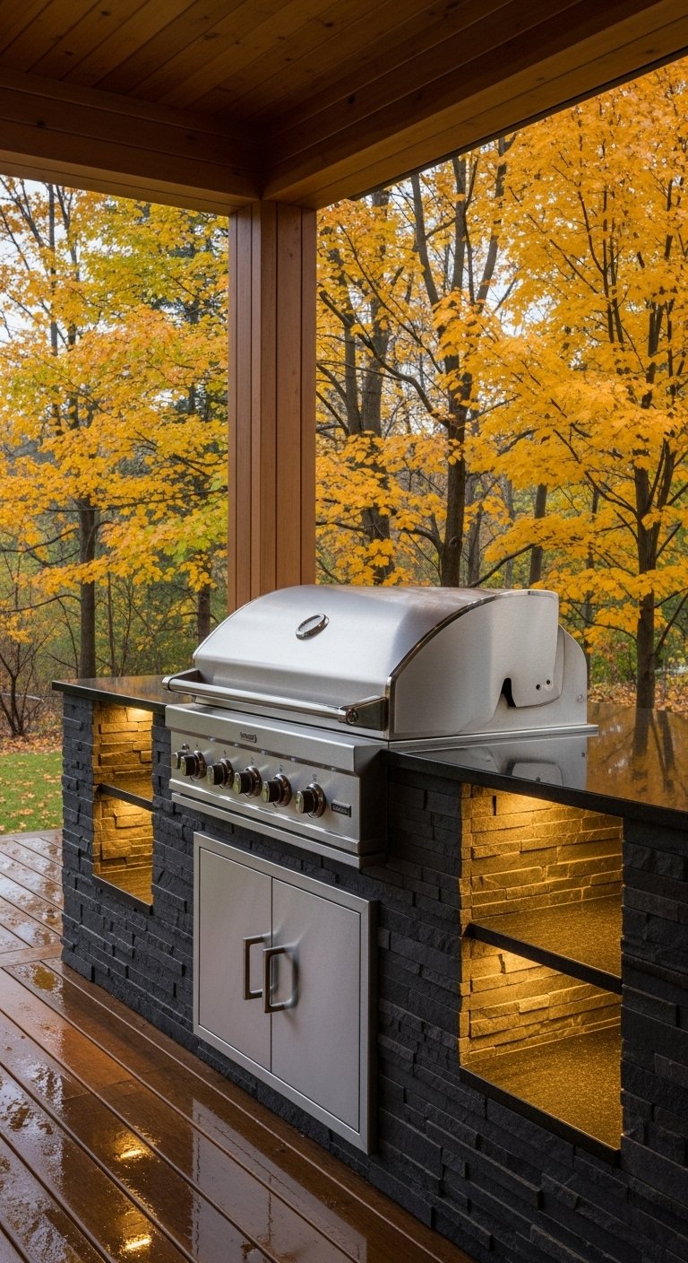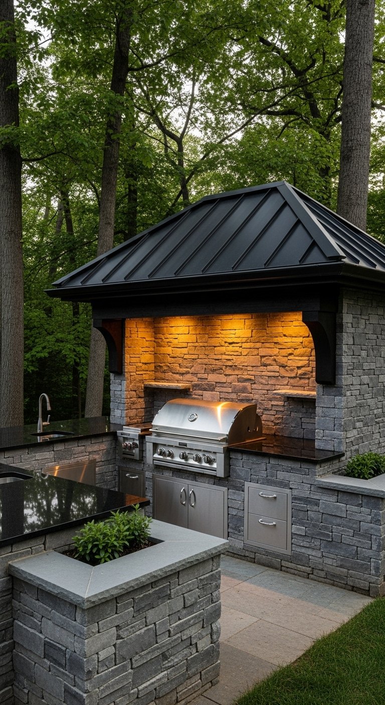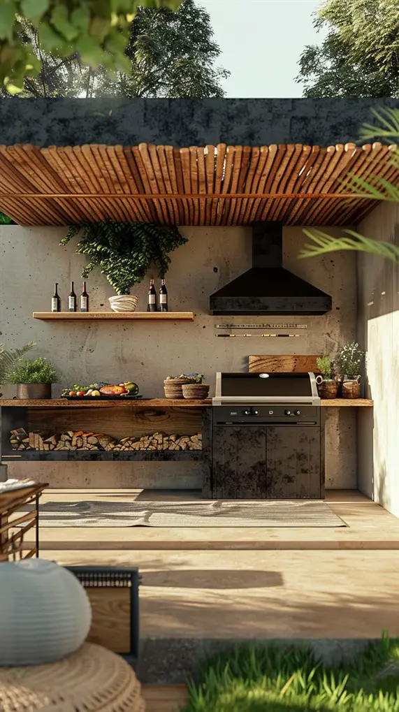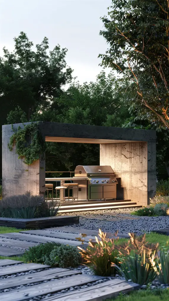 This grill station acts as a focal point, drawing the eye with bold structural elements. It might feature a tall stone backsplash that doubles as a privacy wall or a dramatic cantilevered roof. The design uses geometry to make a statement—squares, rectangles, and distinct vertical lines. Materials often mix raw concrete with warm wood slats to create visual tension. It is not just about grilling; it is about adding a piece of functional sculpture to your property. This style suits modern homes with flat roofs or large glass windows, creating a dialogue between the architecture of the house and the garden.